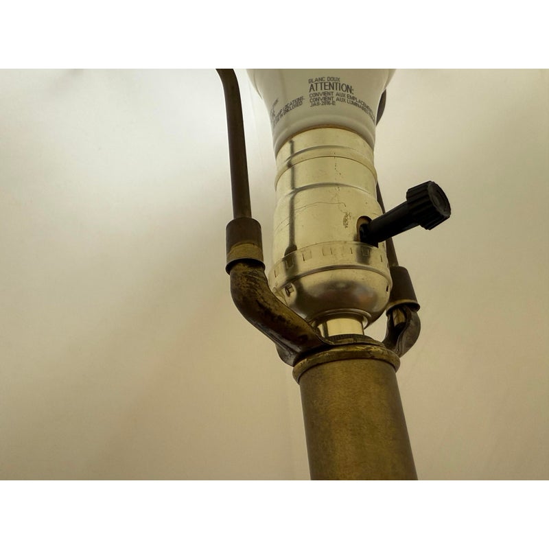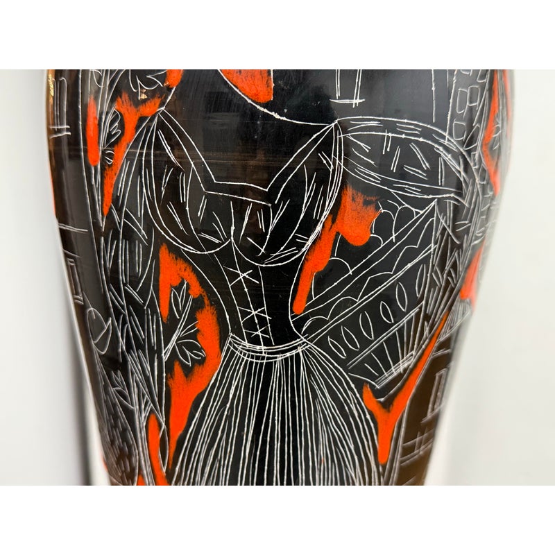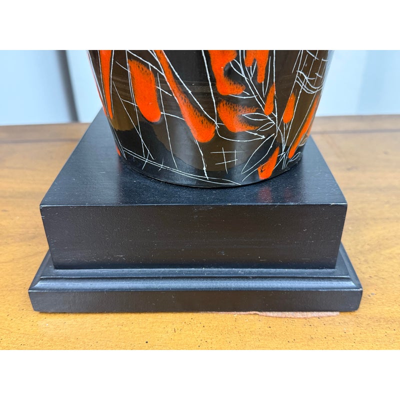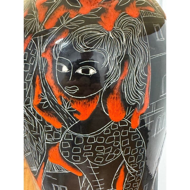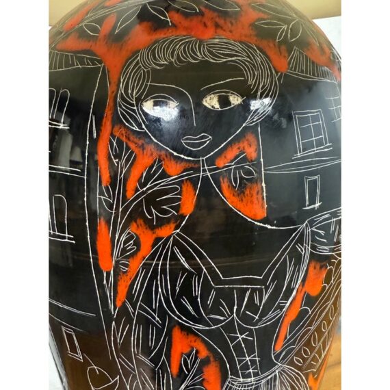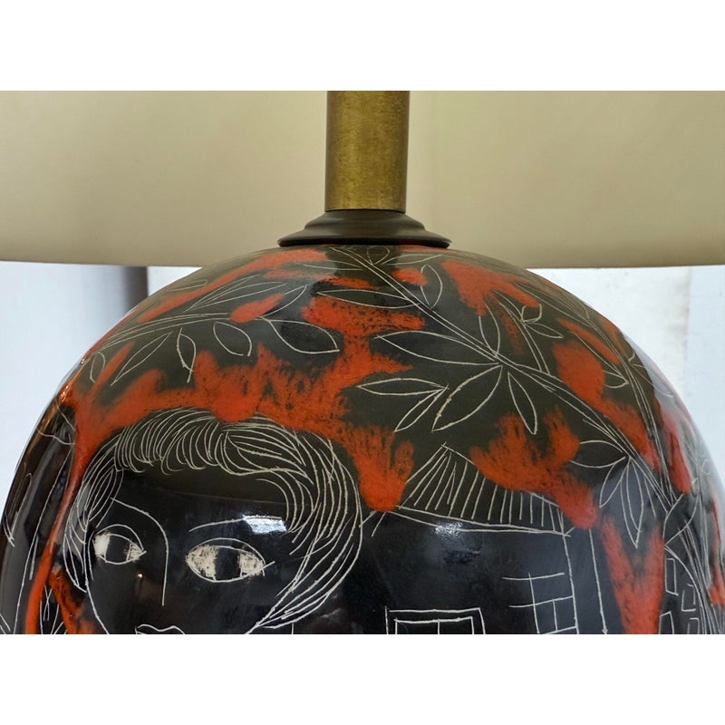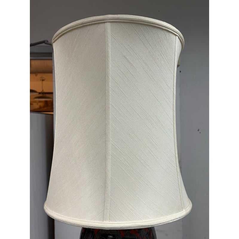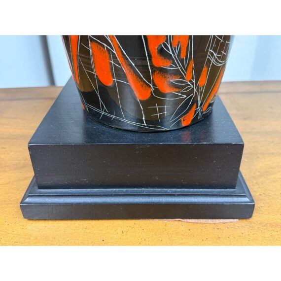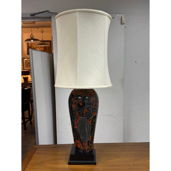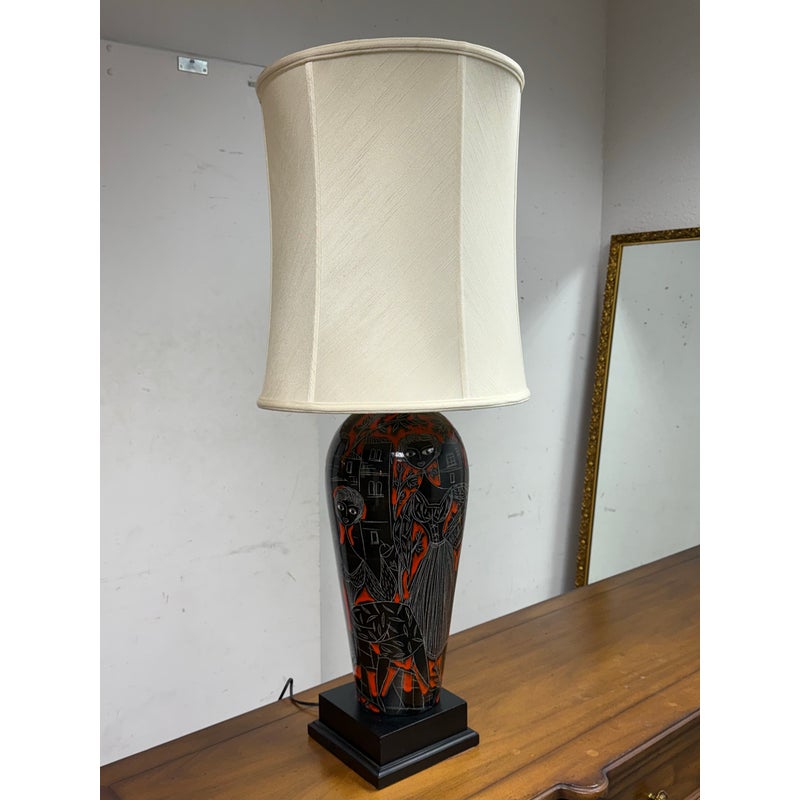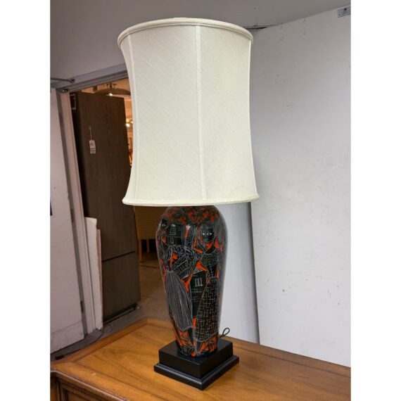 Design Plus Gallery presents a Vintage Ceramic Retro Female Table Lamp. This striking table lamp features a tall ceramic base adorned with an artistic scene: the silhouettes of a graceful woman and urban building structures, all rendered in bold black with crisp white outlines. Set against a vibrant red background, the imagery pops with dramatic contrast and contemporary flair. The lamp sits atop a unique double-frame base finished in sleek black, adding an architectural touch to its form. Completing the design is a classic fabric lampshade, providing warm illumination while balancing the lamp’s statement-making aesthetic. Truly one of a kind, this table lamp serves as both functional lighting and a captivating work of art, perfect for anyone seeking a bold accent piece for their home décor. In good condition, minimal wear from usage.