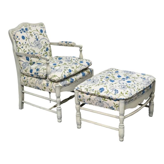Vintage Chair Cream Blue Floral + Ottoman in White Wooden Frame, Set. Original Price: $1,500
