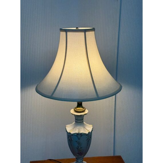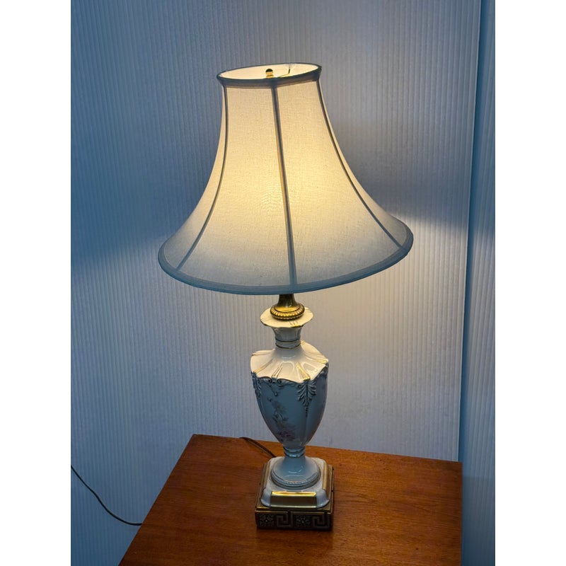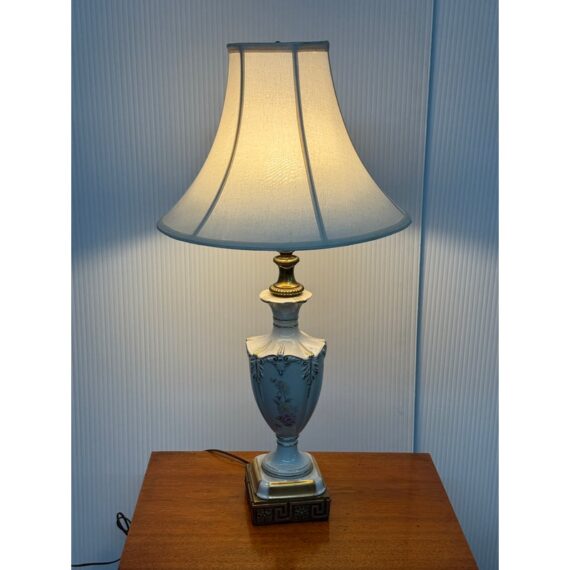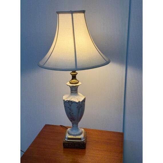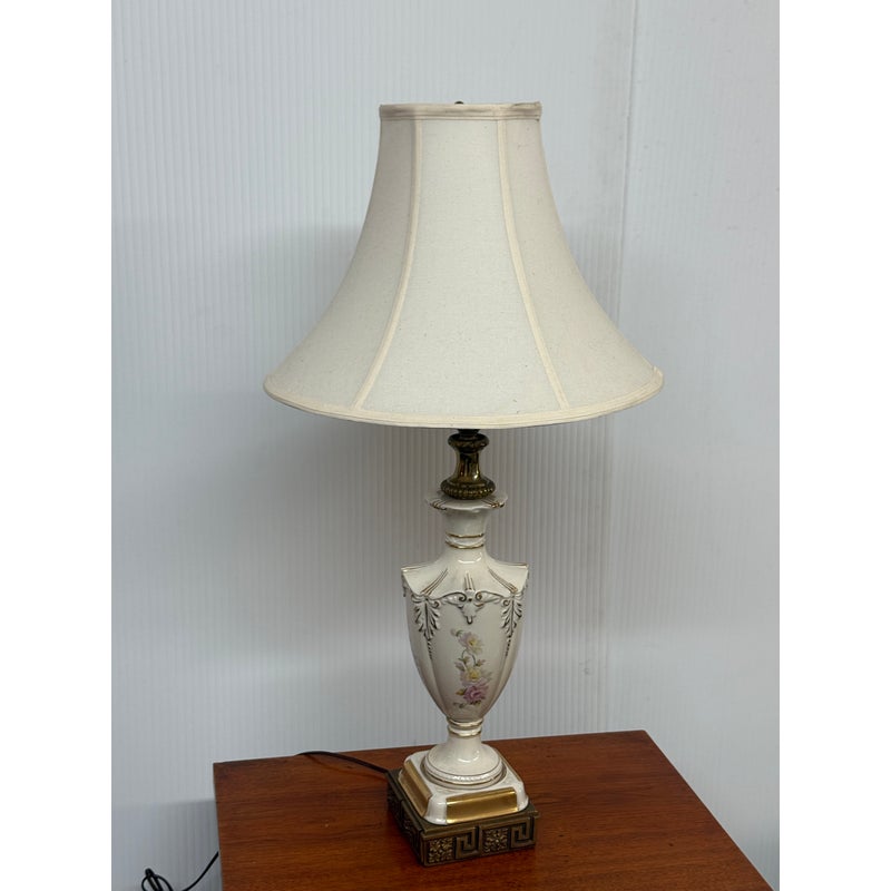 Design Plus Gallery presents a Vintage Jardiniere Table Lamp from Chelsea House. The lamp is in the Italian Regency style and is shown with the ornamental on its porcelain of florals on all sides of the urn shaped lamp. Elevated on embellished + gilt stand then topped with trumpet shaped shade. There is light surface wear; condition is good for age and use.