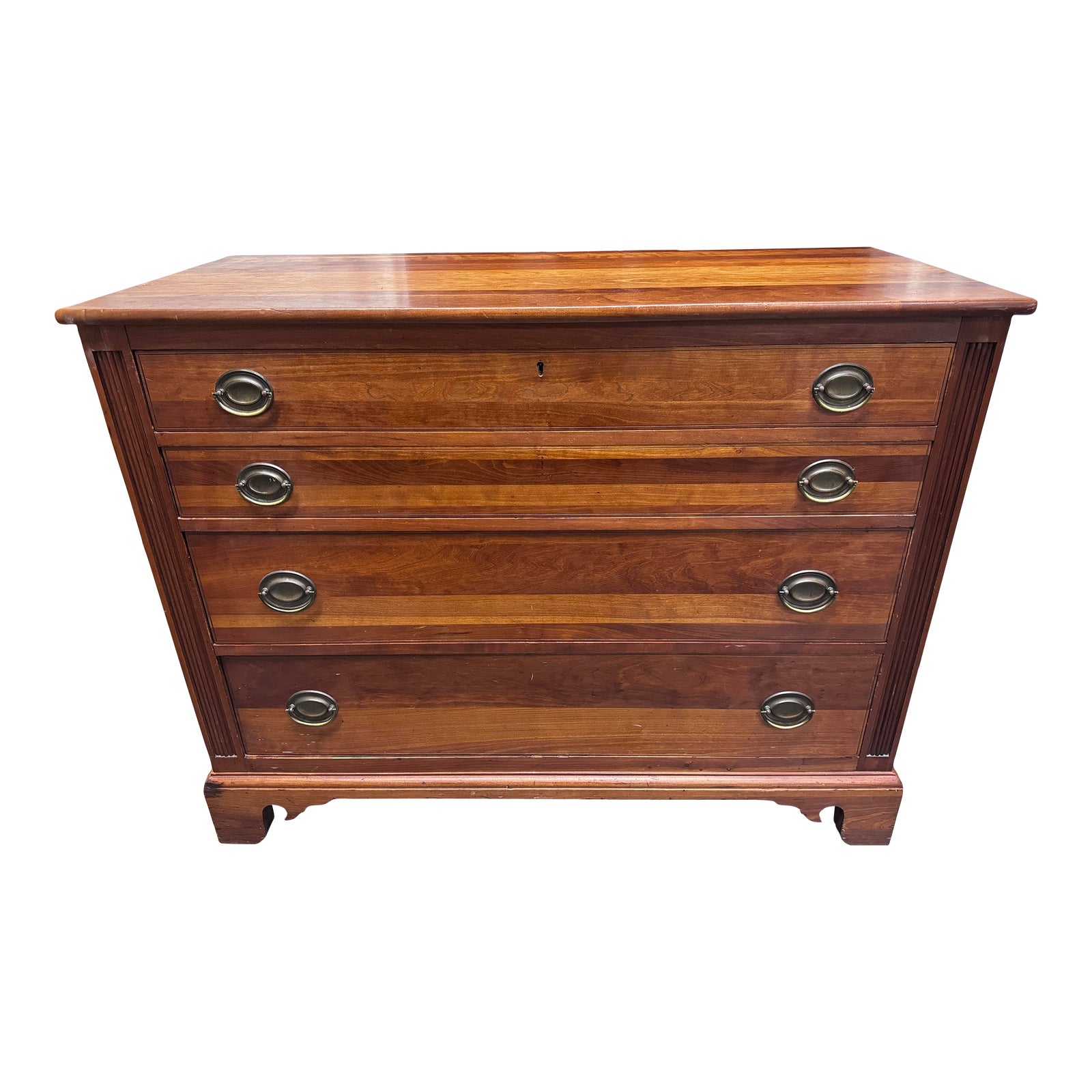Design Plus Gallery presents a Cherry Wood Dresser with Four Drawers. This dresser has beautiful reddish brown hue from the cherry wood that was sourced and used. The top drawer has locking capabilities but unfortunately there is no key attached to it. The four drawers are staggering in depth from shallow to deepest and each has two matching antique drawer pulls. The dresser shows some signs of distress but are overall in good condition with wear that is consistent with its vintage age + use.