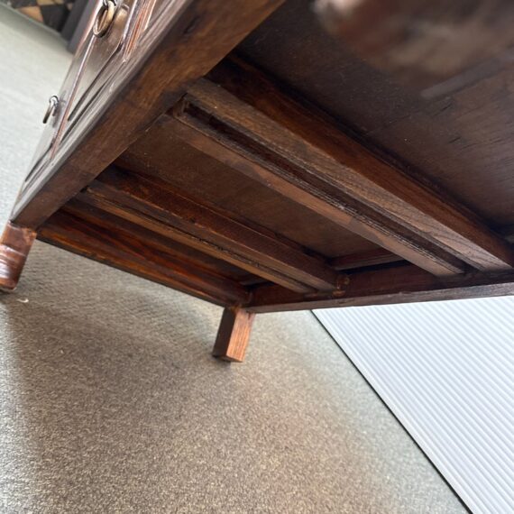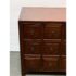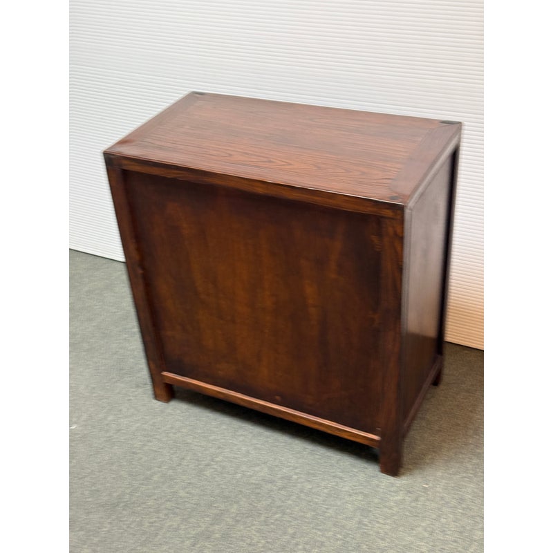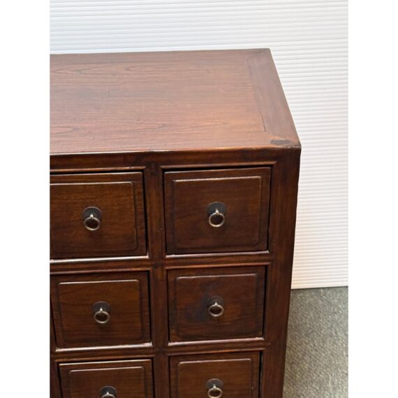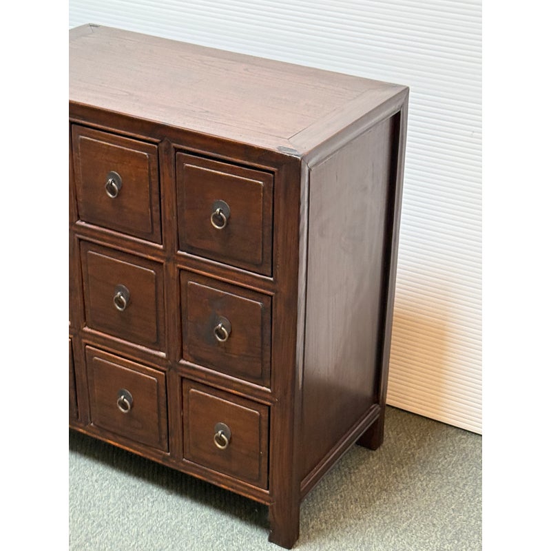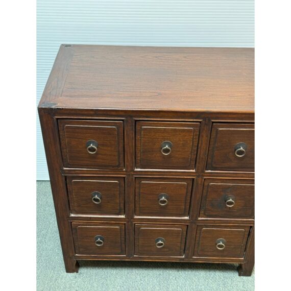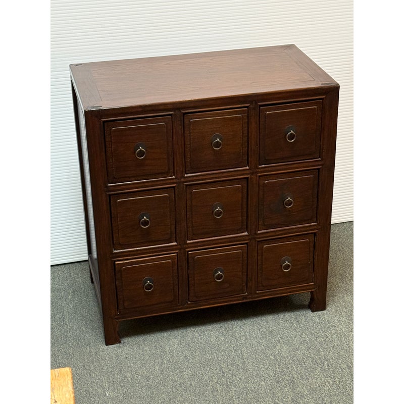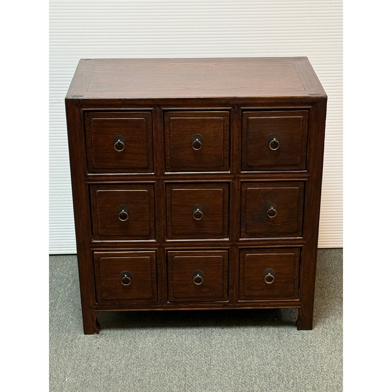 Design Plus Gallery presents a Vintage Chinese Apothecary Chest. Classic nine-drawer storage, the cabinet is handcrafted with dove tail joinery. Small panel-front drawers each have a brass pull. Light surface wear; condition is consistent with age and use.