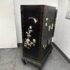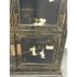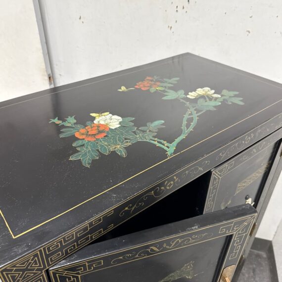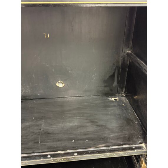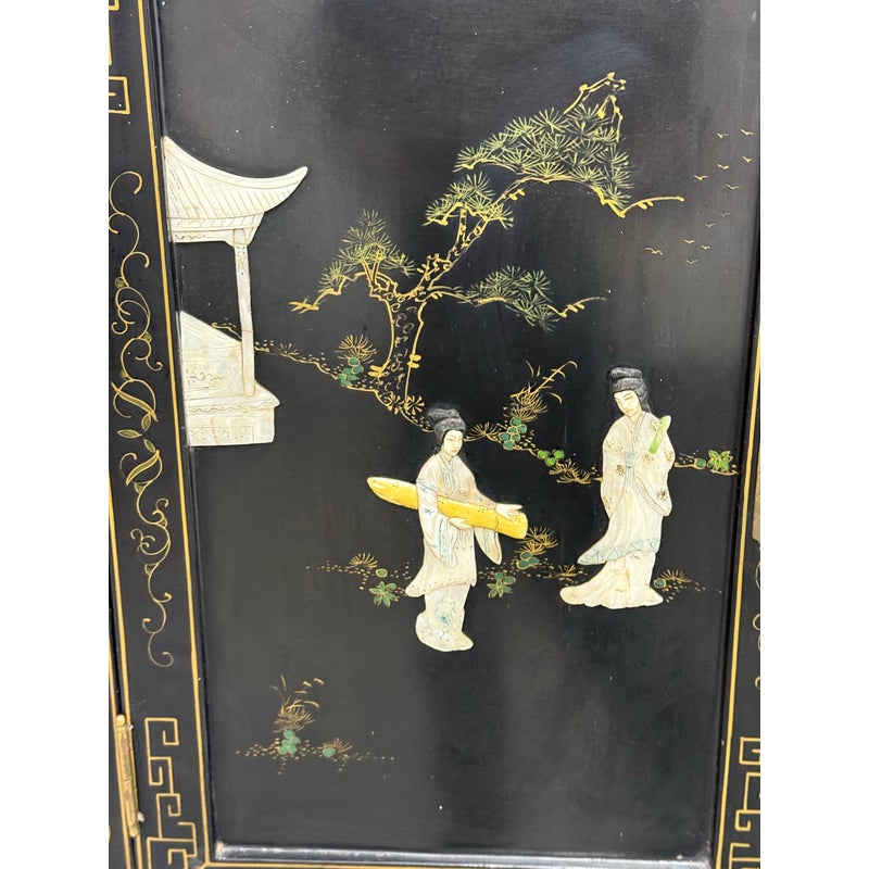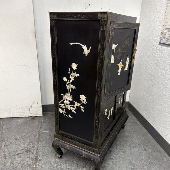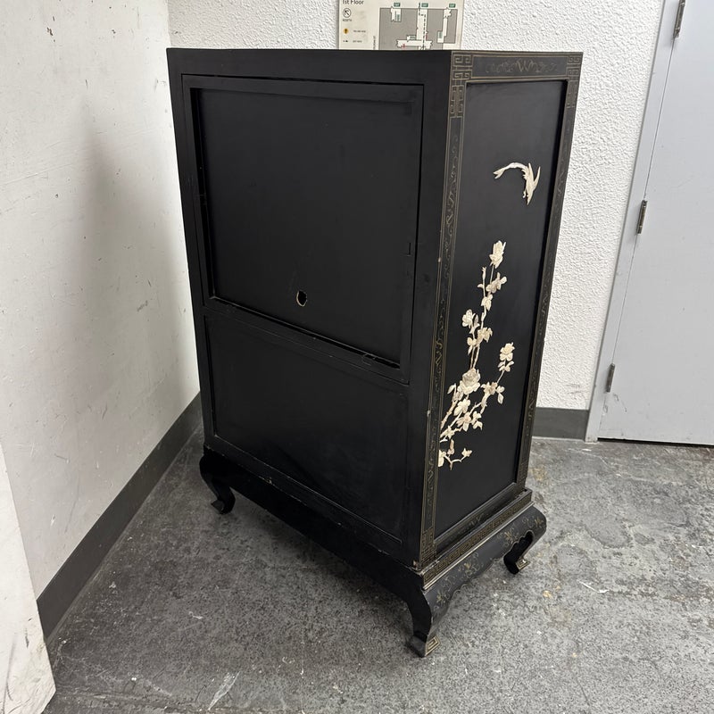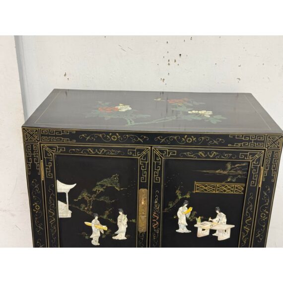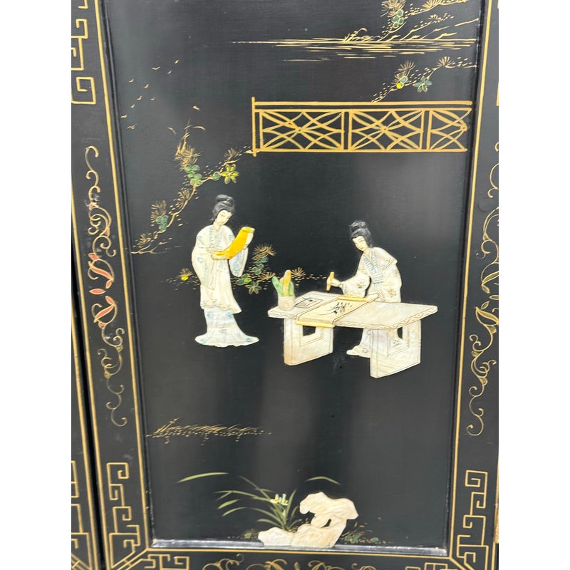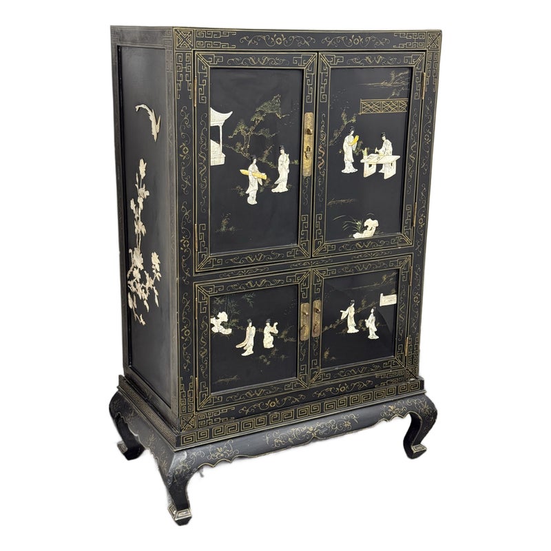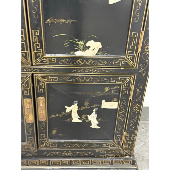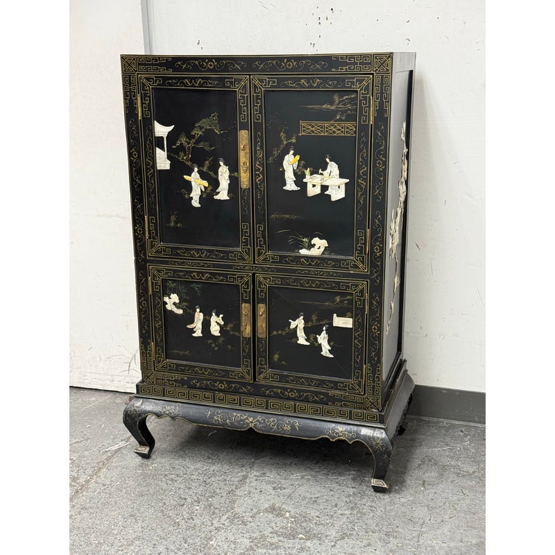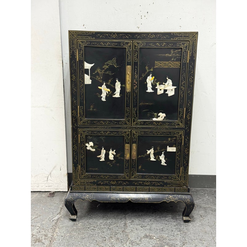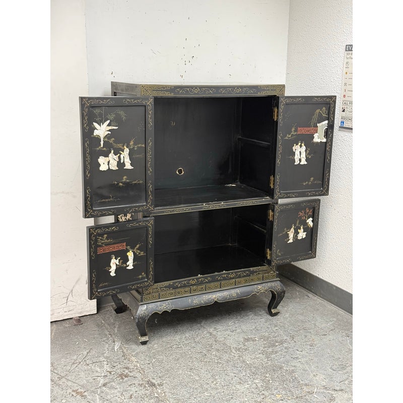 Design Plus Gallery presents a Vintage Black Lacquer Chinese Cabinet with Inlaid Mother of Pearl. There are numerous scenes inside and outside with a golden stenciled border running all along the borders of doors and panels. In good vintage condition, missing the shelves and have visible and minimal wear from usage. Missing pens and one brass plate hardware.
