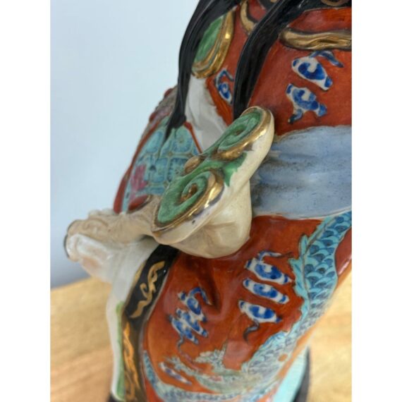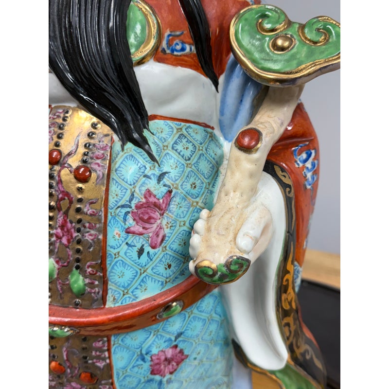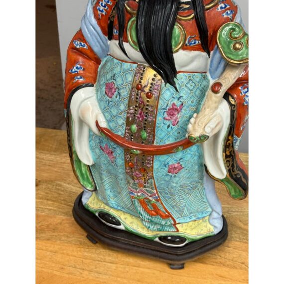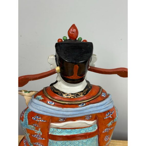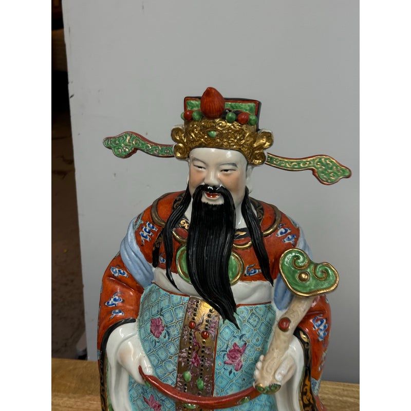 Design Plus Gallery presents Chinese Ceramic figure of LuXing. One of the SanXing, or Three Stars, in Chinese mythology. The deity of Lu Xing is of prosperity and official emolument (the salary and benefits of an official position). He is often depicted as a scholar or official, holding a ruyi scepter, which symbolizes good fortune and power, as seen in the image. LuXing, along with FuXing (fortune) and ShouXing (longevity), form the SanXing, a triad of deities revered in Chinese folk religion and Taoism for bringing good fortune, prosperity, and longevity. In good condition, minimal wear. Comes with a custom wood stand.