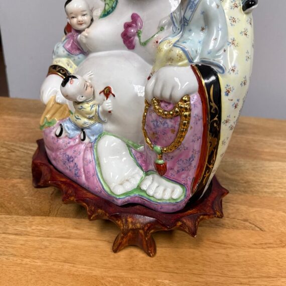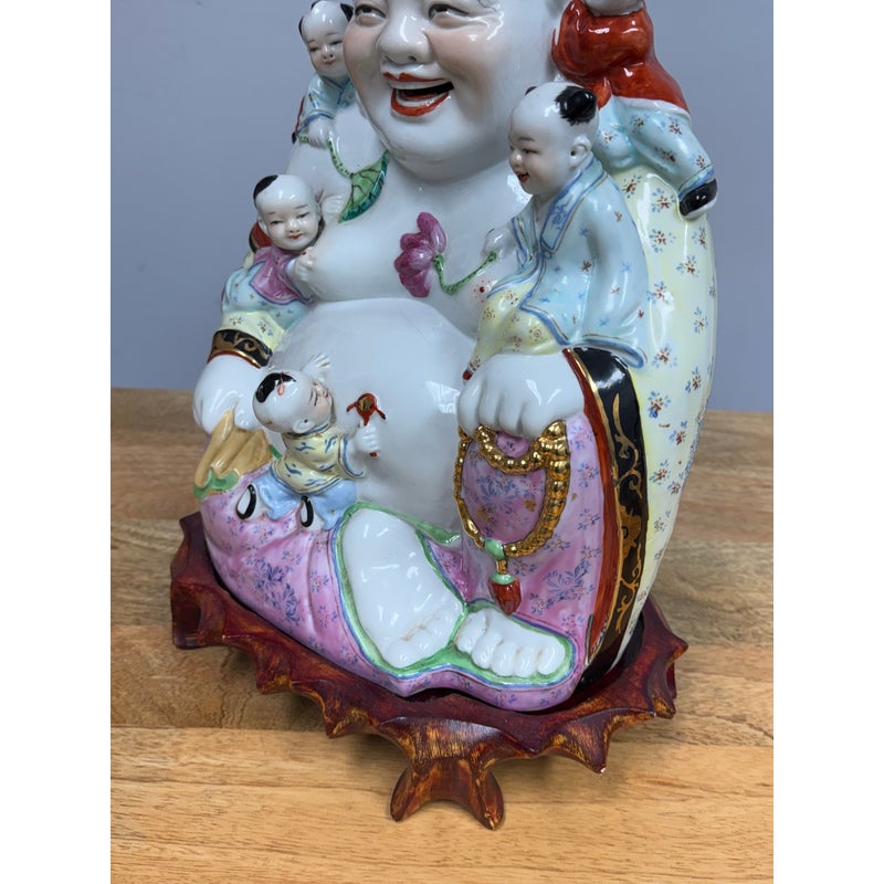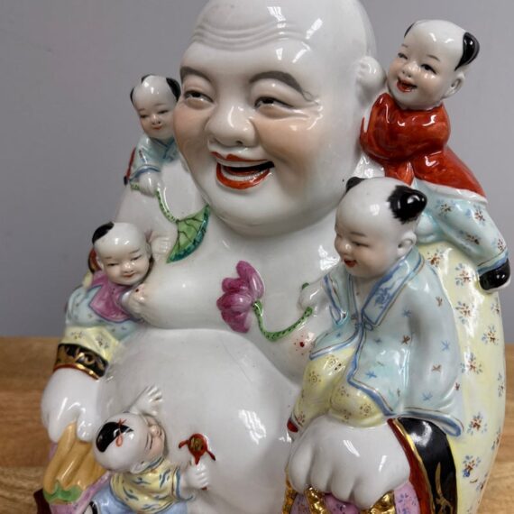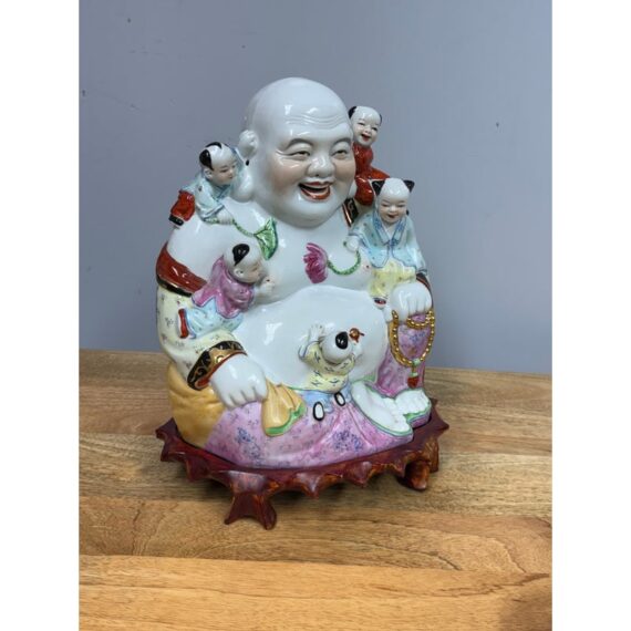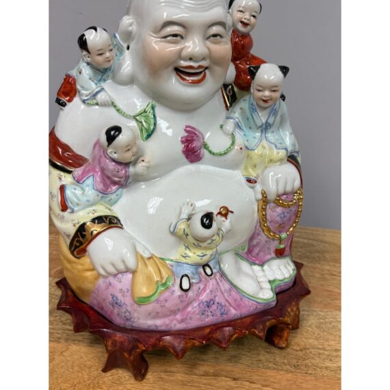 Design Plus Gallery presents a Vintage Ceramic of Chinese Laughing Buddha. This type of figurine is often referred to as “Happy Family” or “Buddha with Five Children”. Hotei is a prominent figure in Chinese folklore and is often associated with Maitreya, the future Buddha, in Buddhist traditions. He is known for his jovial appearance, large belly, and association with good fortune, abundance, and contentment. The presence of children around Hotei symbolizes fertility, prosperity, and a happy family life. In good condition, minimal wear. Comes with a custom wood stand.