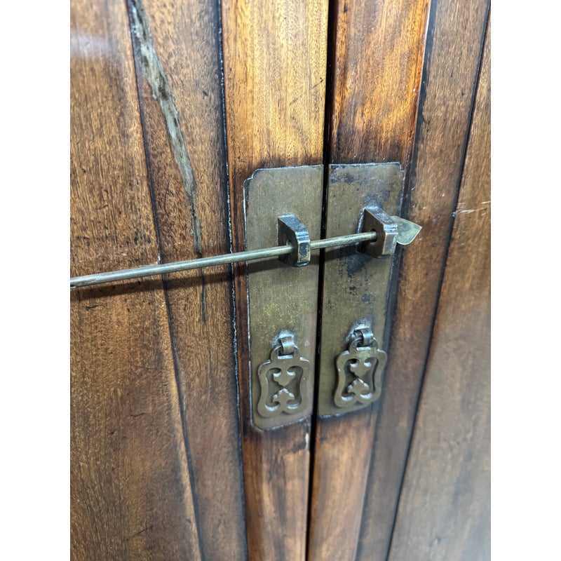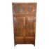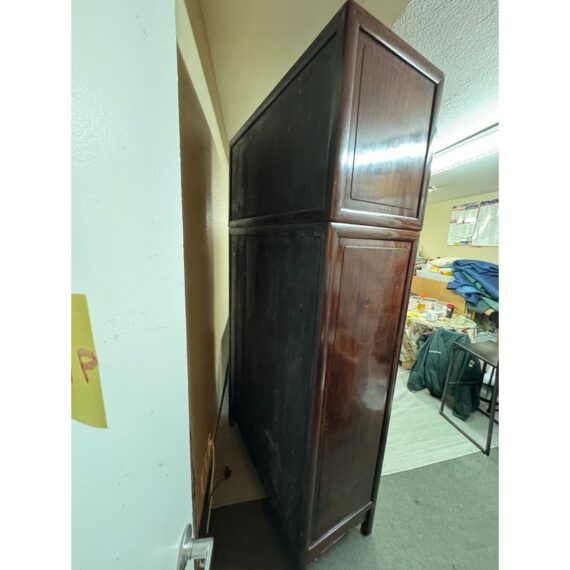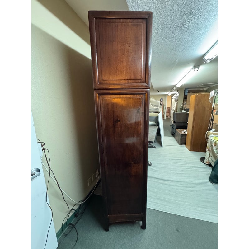 Design Plus Gallery presents an Antique Chinese Compound Cabinet. The 2pc cabinet consists of a tall, lower unit (with hidden compartment in base) is topped by an upper unit or hat chest, both constructed from the same durable wood. These cabinets were designed for the storage of garments, which were folded and laid flat rather than hung. Since traditional Chinese houses did not feature built-in closets, these cabinets were also utilized in bedrooms settings. This elegant cabinet, with carved panels, stands on short corner legs. Condition is consistent with age and use.