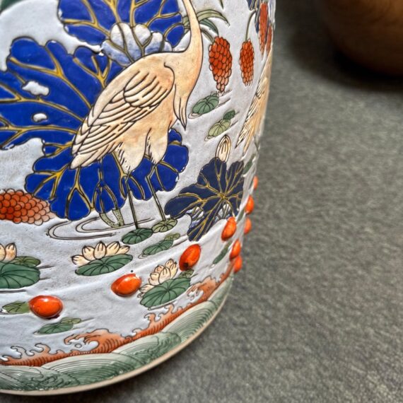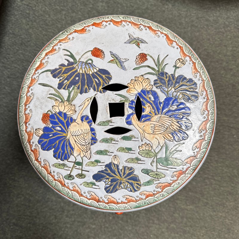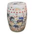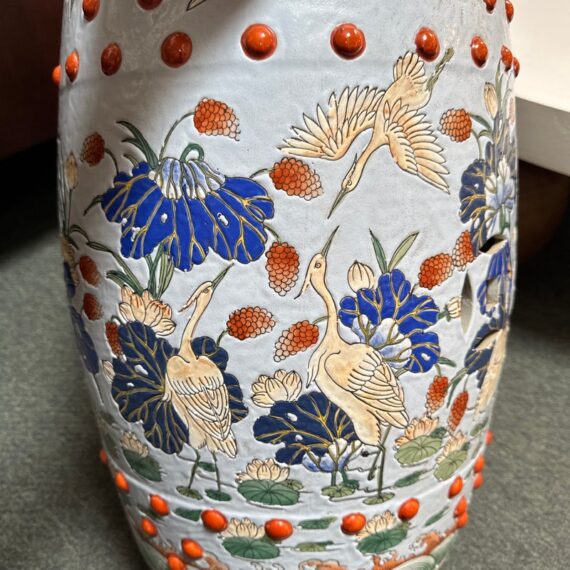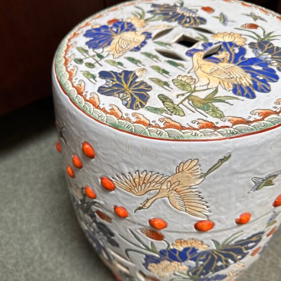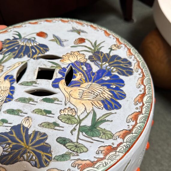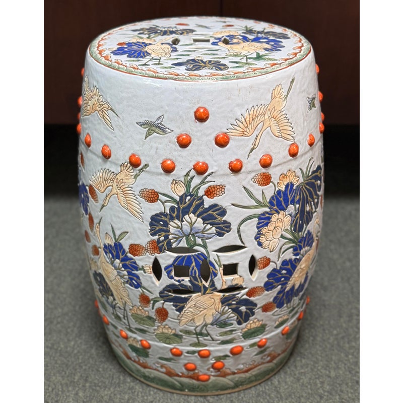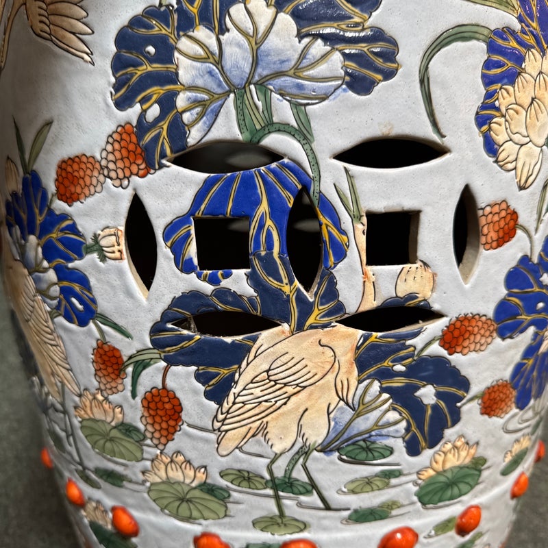 Design Plus Gallery presents a Vintage Chinese Garden Stool. This beautiful stool is crafted in durable glazed ceramic for use as stool or side table, and shows classic pierced detail. Delicately enhanced with a lovely hand painted floral and fauna motif with dimension added from raised spots. Functions for indoors or outdoors. Light surface wear; condition is good for age and use.