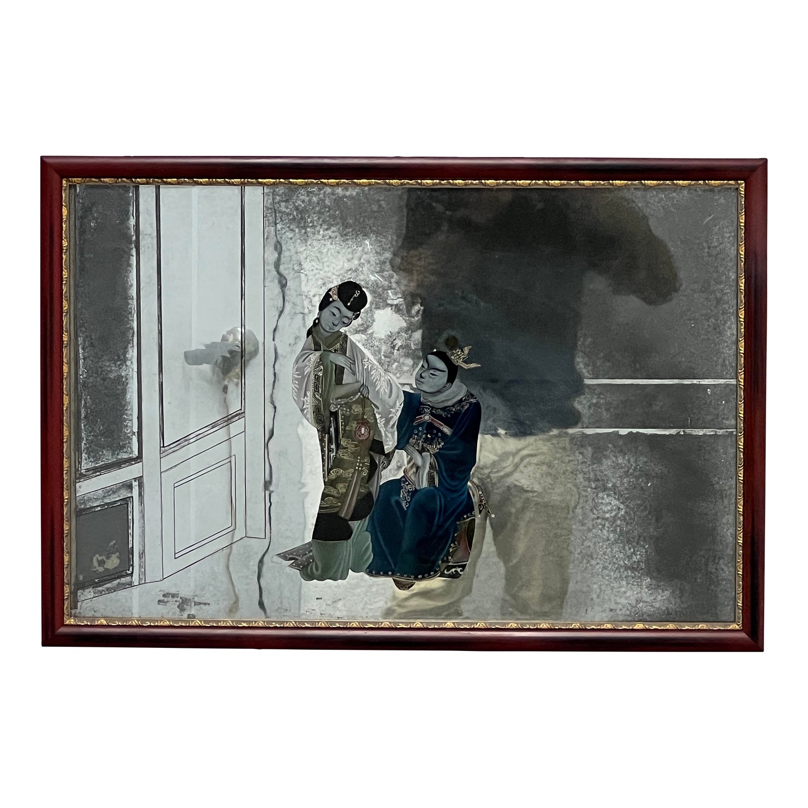 Design Plus Gallery presents a Vintage Chinese Hand Painted Wall Mirror. A female + male figures are painted on the mirror. The back of the mirror have ben painted with a metallic silver with a patina inspiration. The wood frame is in a dark oxblood finish with gold carved finish. Visible and minor wear from usage + age.