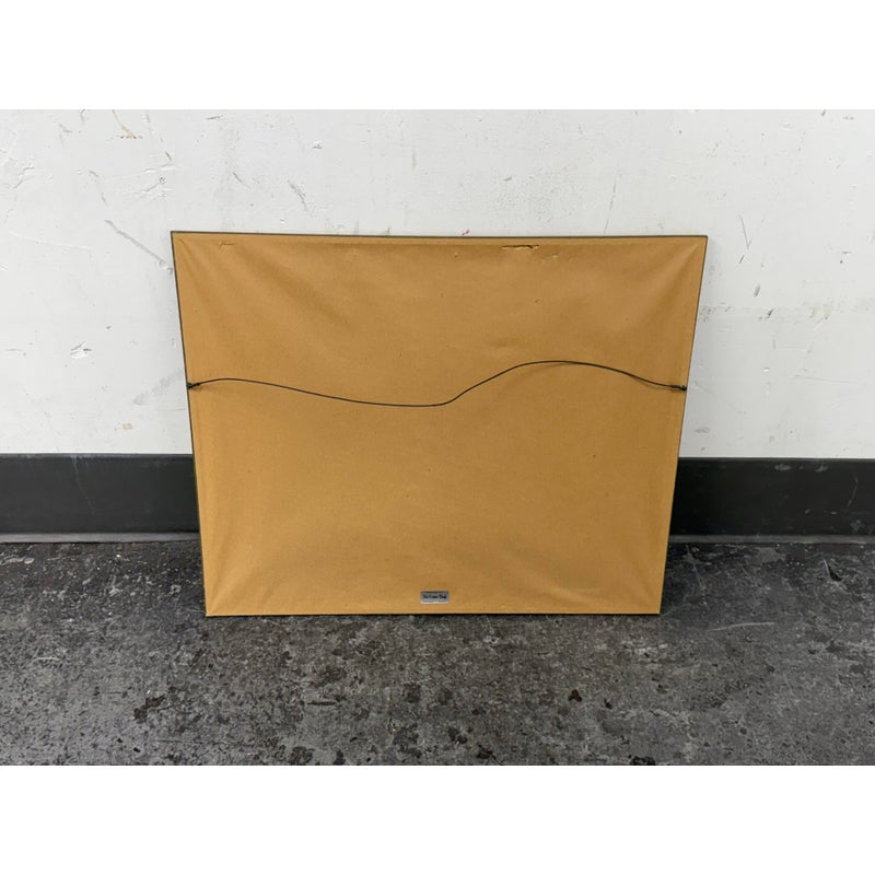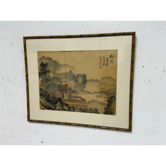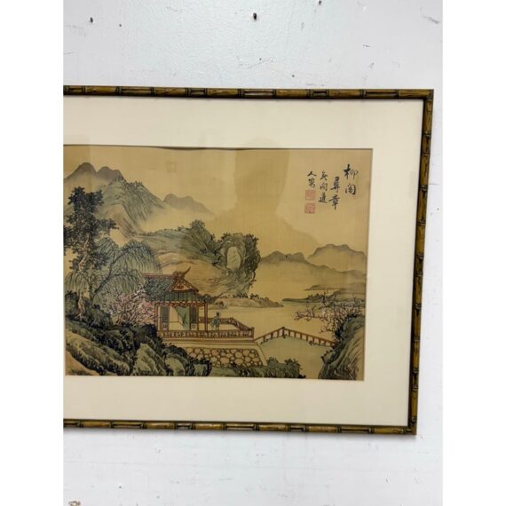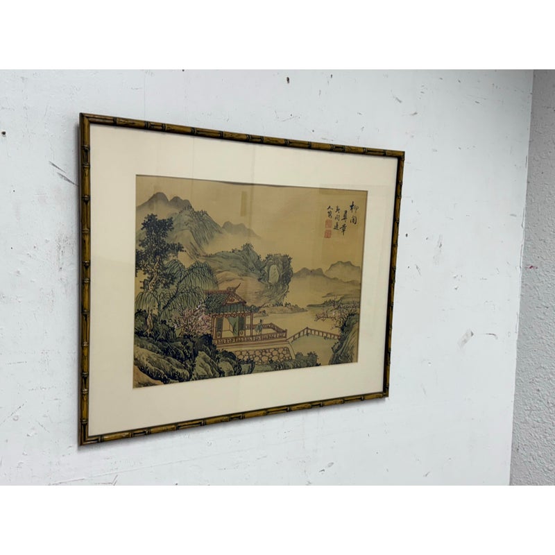 Design Plus Gallery presents a Vintage Chinese Landscape Art Work in Bamboo Frame. Its scenery is serene; a home in a area with a river, set back from the mountain ranges with lush vegetation in a remote area. The art has been thoughtfully framed in a patinated bronze + matted. In good condition, visible and minimal wear from usage.