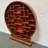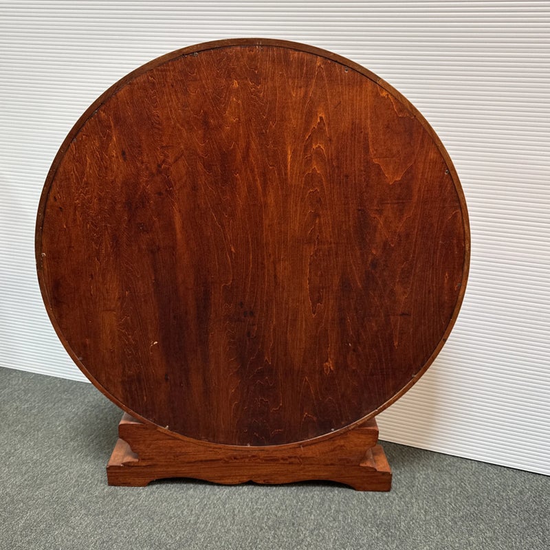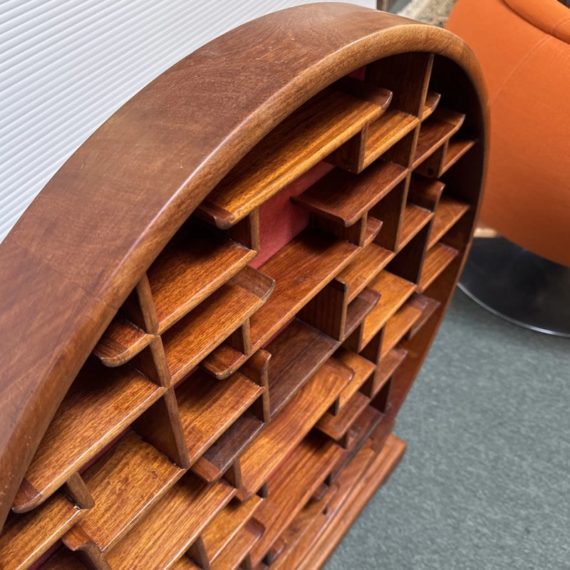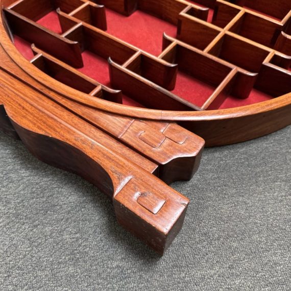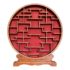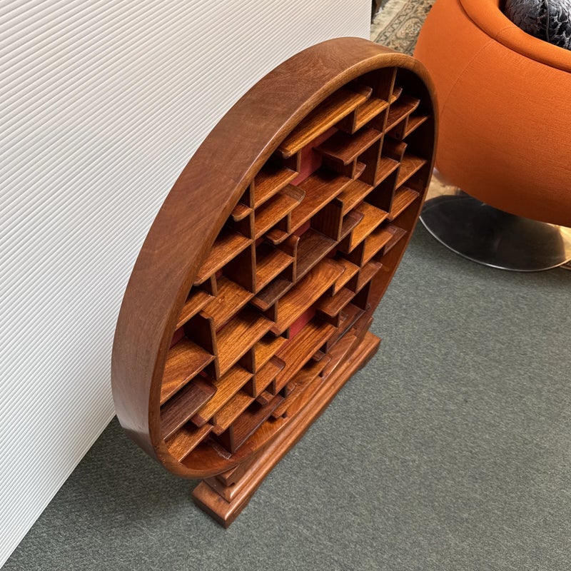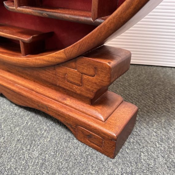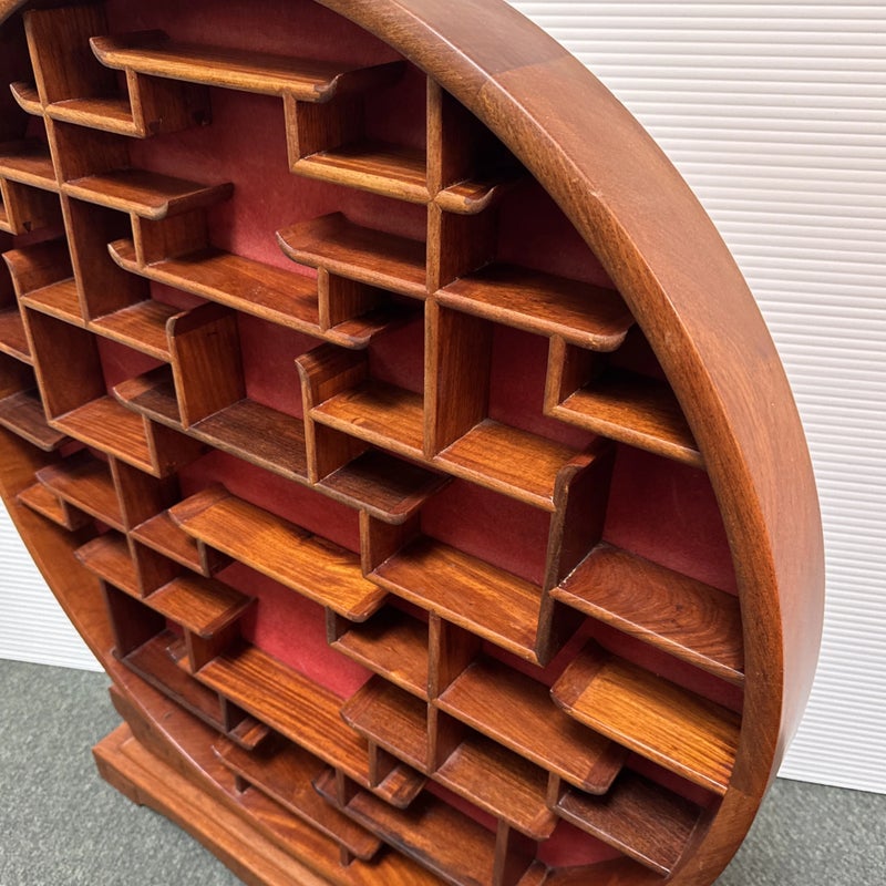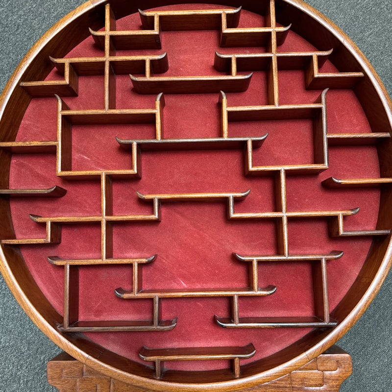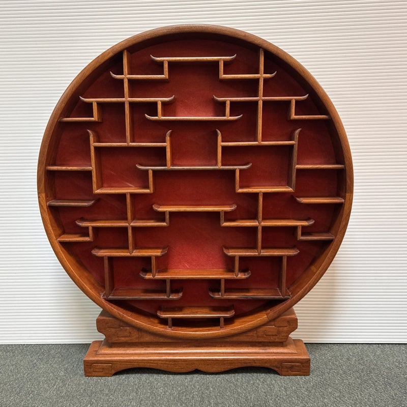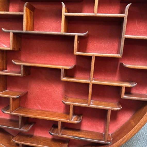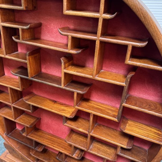 Design Plus Gallery presents a Vintage Chinese Moon Curio Display Stand. Creating dramatic impact in a shallow space, the beautifully configured shelving is backed with rich red velvet. Solid wood, the base has a carved motif. Light surface wear; condition is good for age and use.