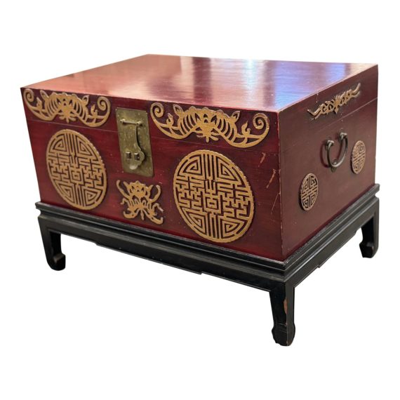 Vintage Chinese Red Lacquer Double Happiness Trunk + Stand