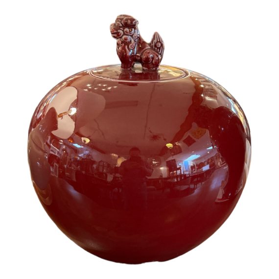 Design Plus Gallery presents a Vintage Chinese Shizi Lidded Large Oxblood Vessel. This ceramic vessel was handcrafted in the Jiangxi region of China in the spirit of ancient temple jars. The style and glaze is reminiscent of Han dynasty burial vessels designed to store wine for passage to the afterlife. . The lid is topped with a lion fu dog protector to guard the jar’s sacred contents. In good condition with minor wear.