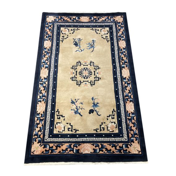 / Vintage Chinese Style Navy Ivory Small Area Rug – 3′ × 5′1″