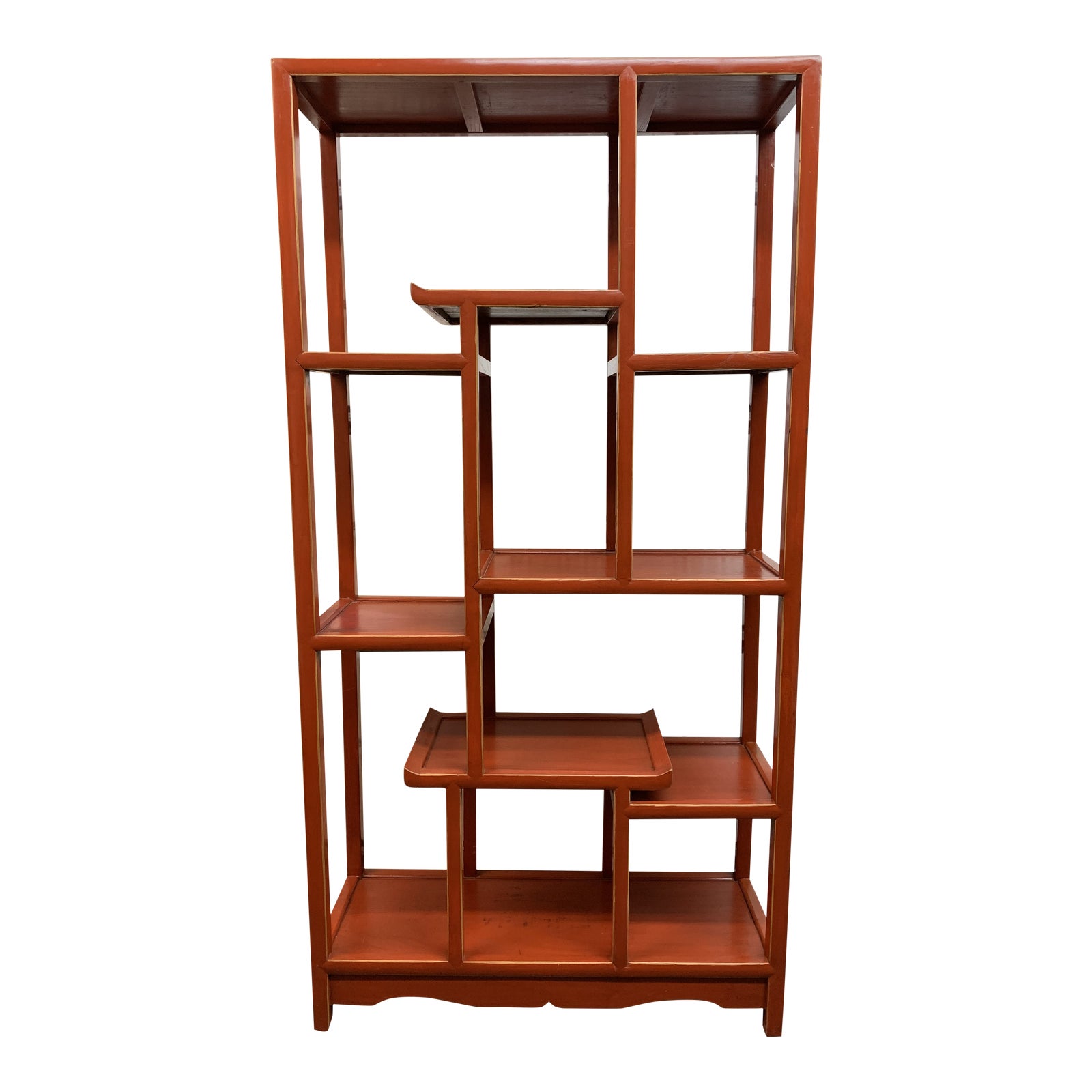Design Plus Gallery presents a Vintage Chinoiserie Etagere. Resplendent in Chinese red with rubbed edge revealing a hint of gold. Different sized shelves at various heights have room for displaying your treasures.