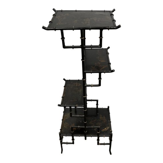 Design Plus Gallery presents a Vintage Chinoiserie Padoga Style Metal Side Table. The metal work is so interesting with its rod like appearance and golden painted village scenes. There are four different size shelves that are staggered in placement. Overall the table is in good vintage condition. Visible and minor wear from usage + age.