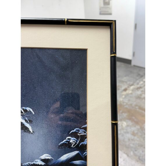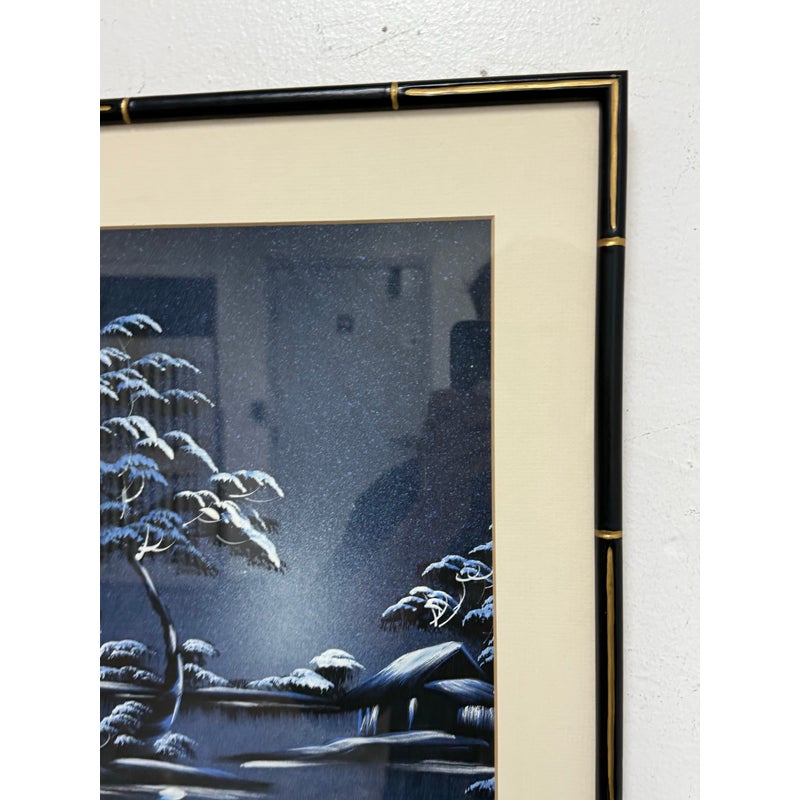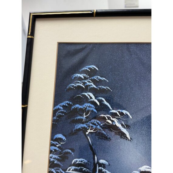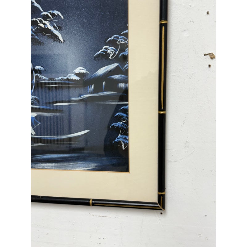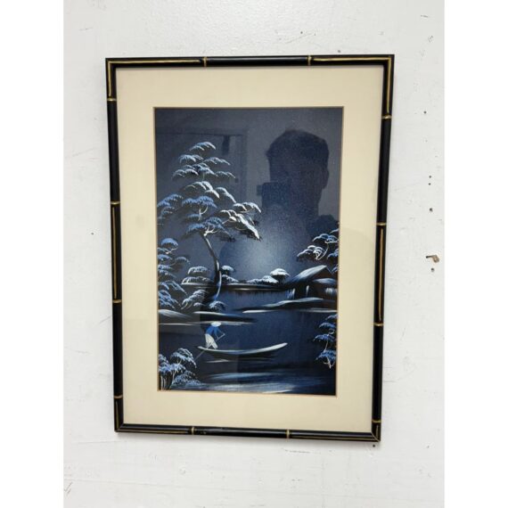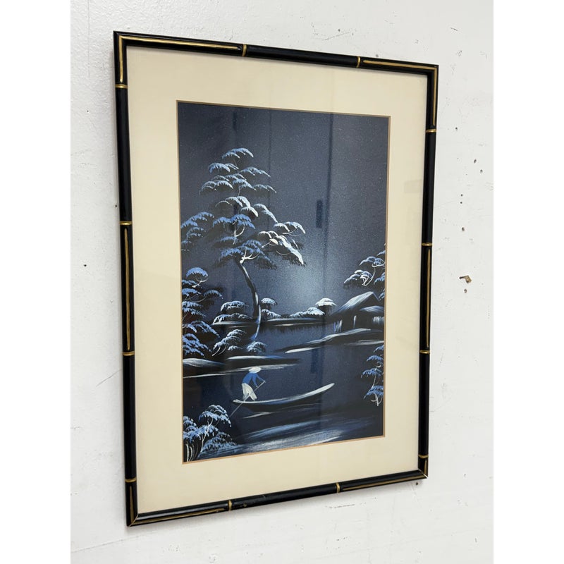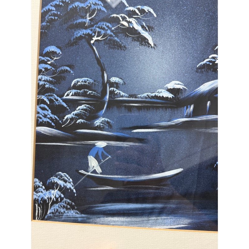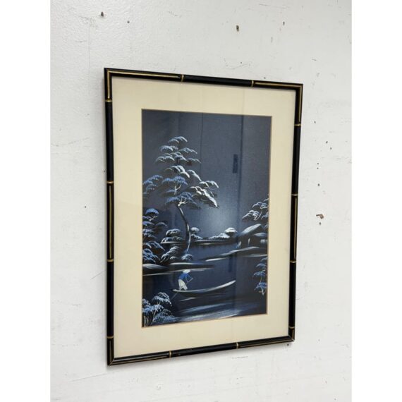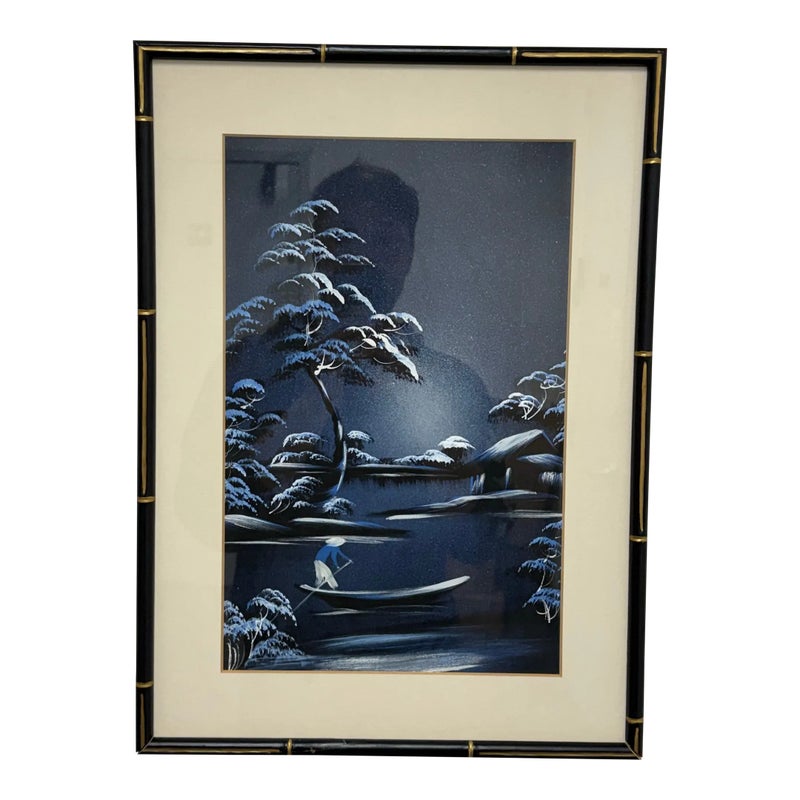 Design Plus Gallery presents a Vintage Chinoiserie Silk This vintage Asian silk painting. Captures a serene lakeside landscape rendered in soothing blues and whites. The composition features a solitary figure standing in a small boat, gently floating on calm waters surrounded by softly undulating hills and distant foliage. The delicate brushwork and subtle tonal variations in blue convey a tranquil, almost ethereal atmosphere, evoking a quiet moment of reflection amid nature’s stillness. The use of traditional silk as the painting’s canvas enhances the piece’s refined, timeless beauty. In good condition, visible and minimal were.