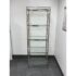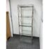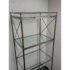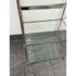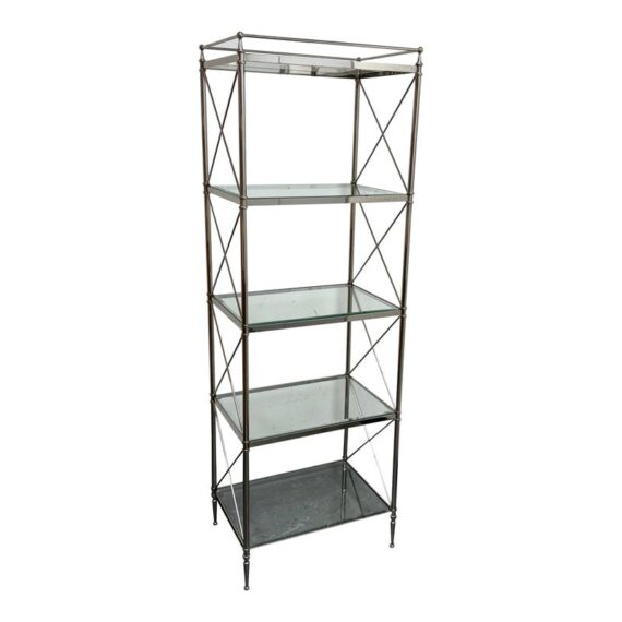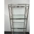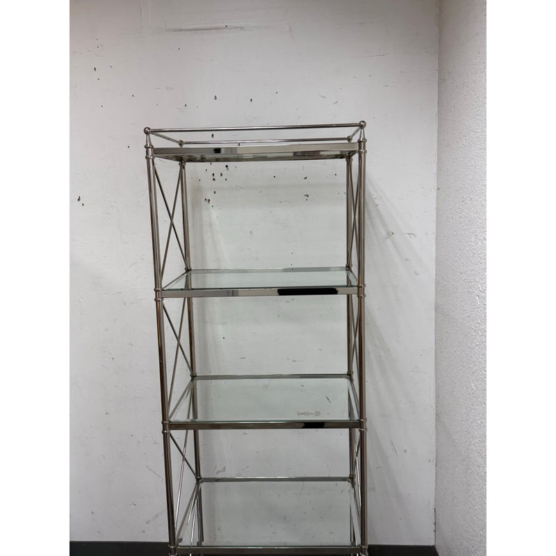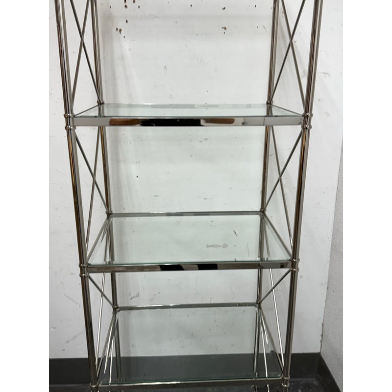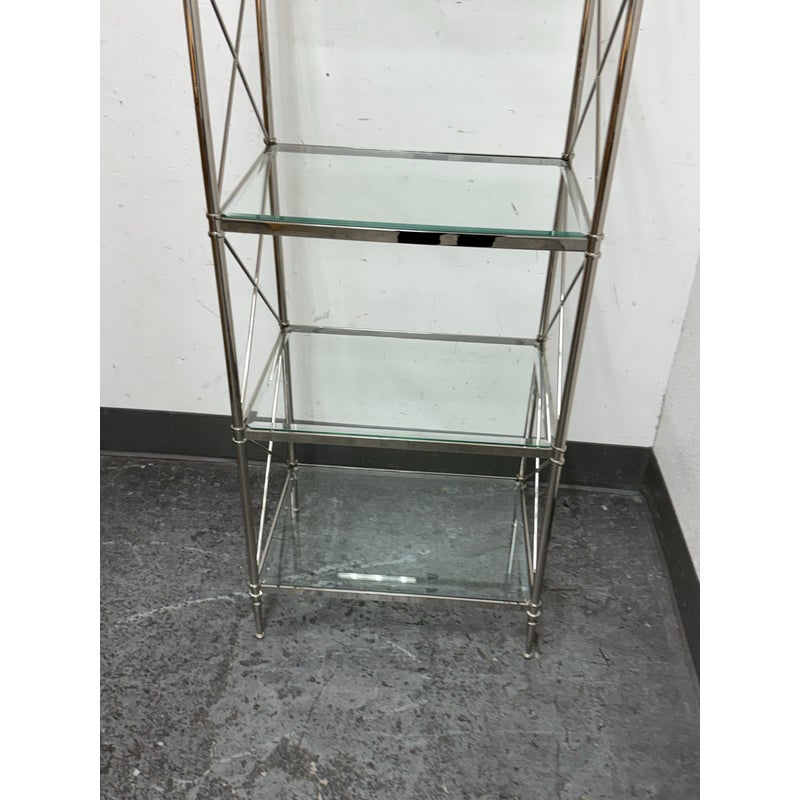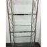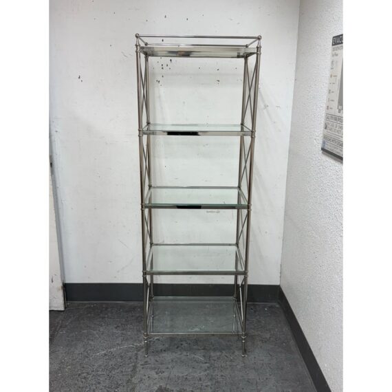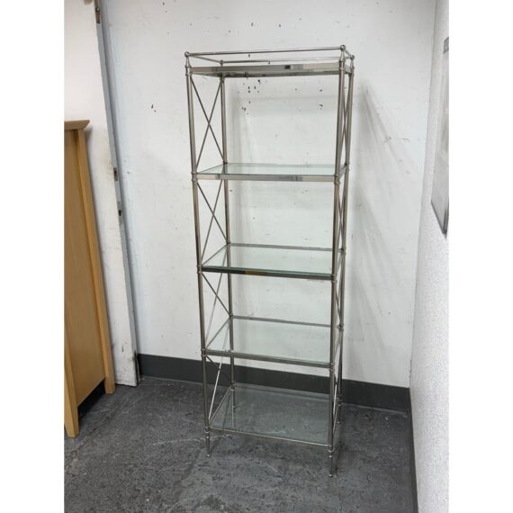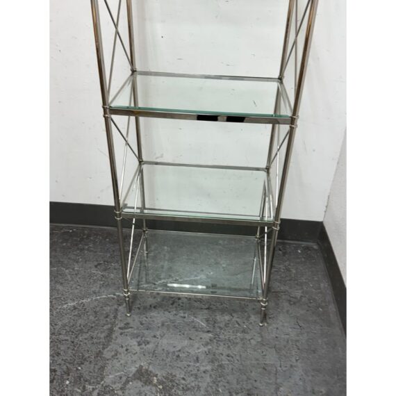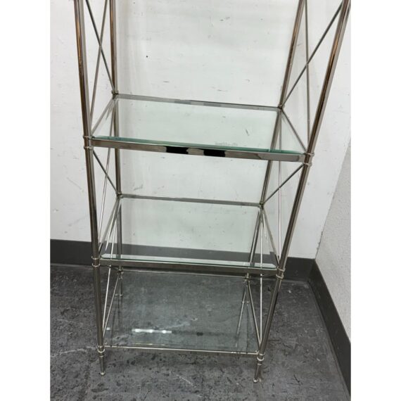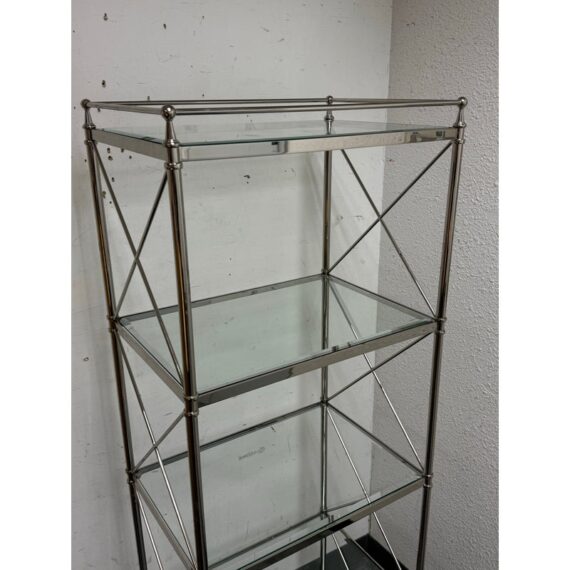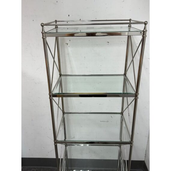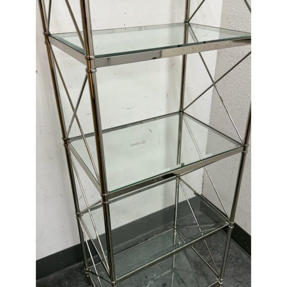 Design Plus Gallery presents a Chrome Campaign Style Etagere of Vintage Age. The chrome frame is cross hatched on the sides with a gallery going around its very top shelf. There are five glass shelves that seem to be floating within the chrome metal frame. It is in good condition with minimal visible wear for its usage.