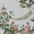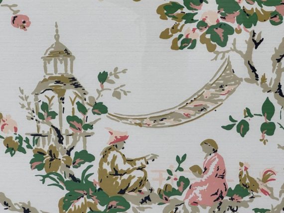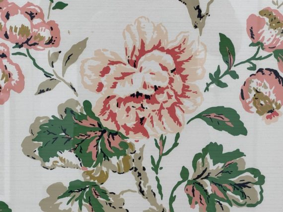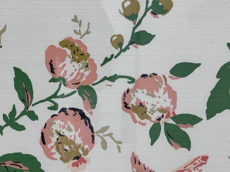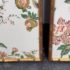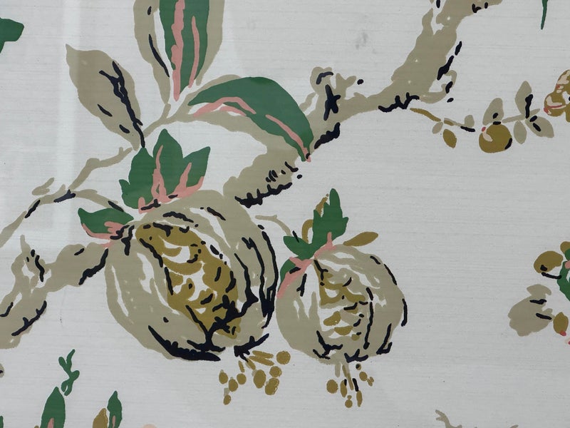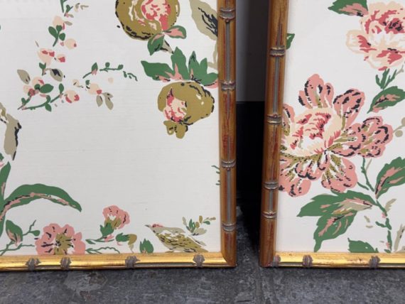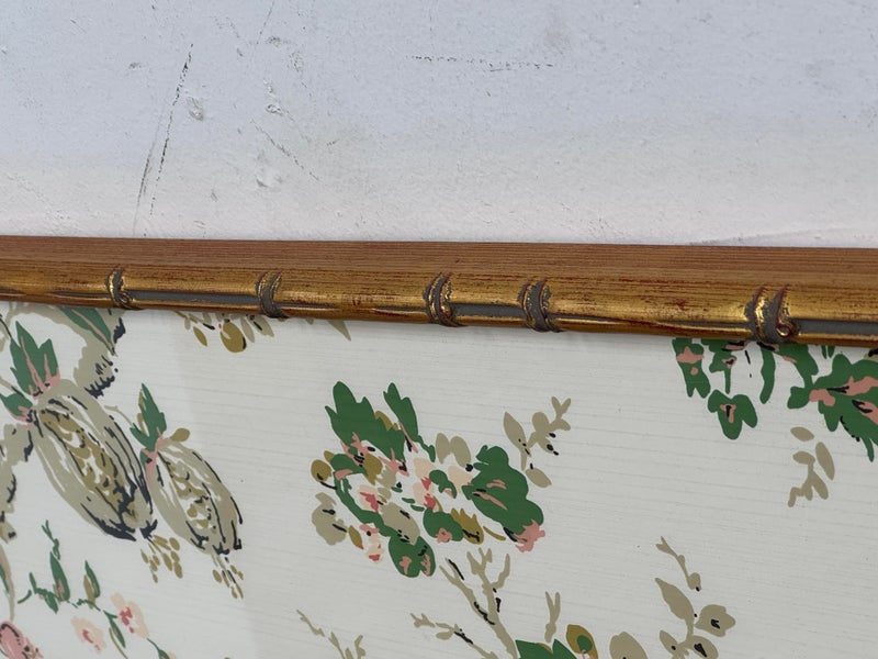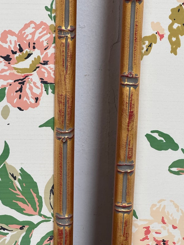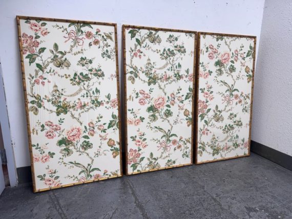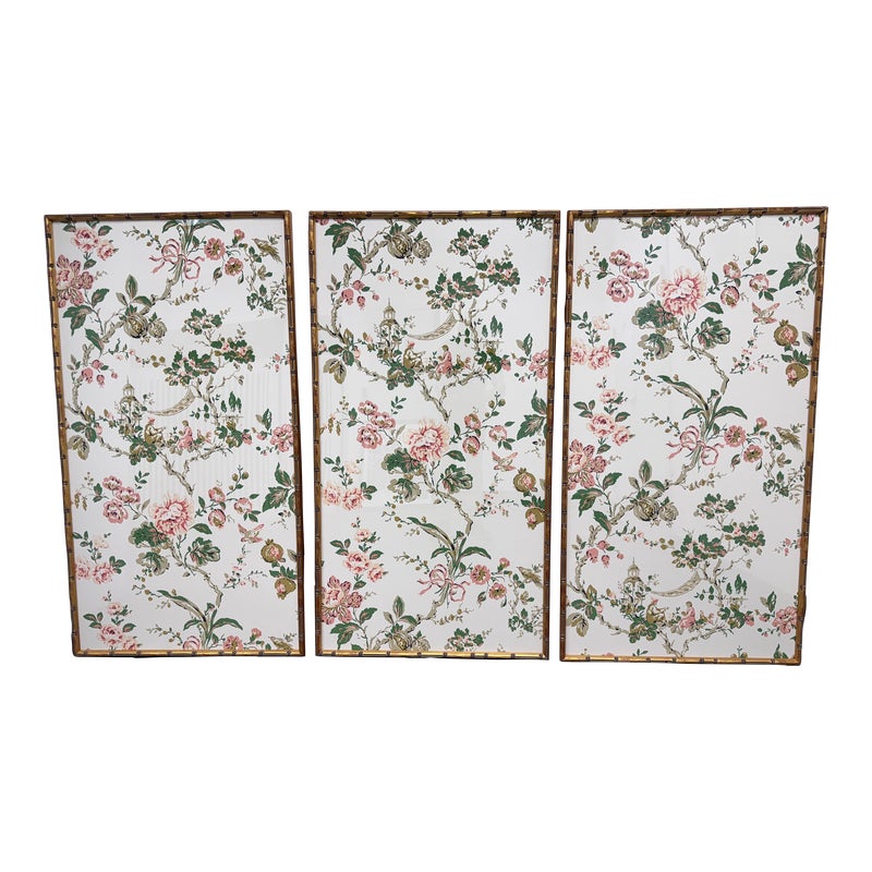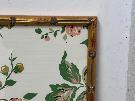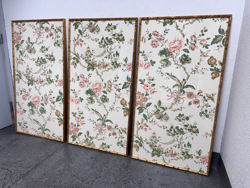 Design Plus Gallery presents a Set of Three Framed Vintage Chinoiserie Wall Paper. Custom framed in a gold finish faux bamboo style. Florals of prink and greens over a off white bkacground. In good condition, visible and minimal wear.