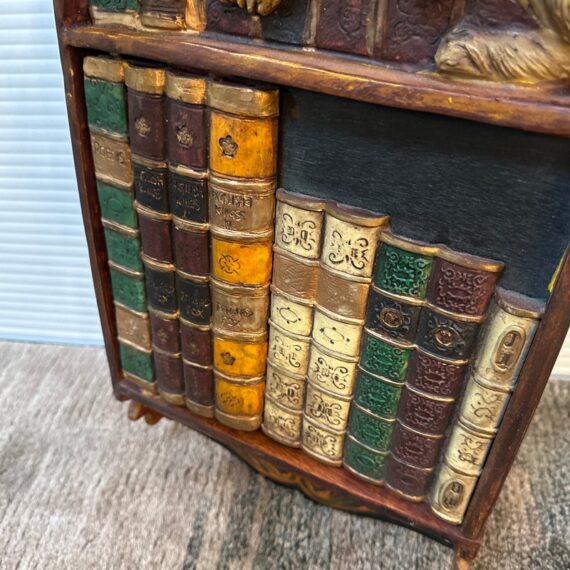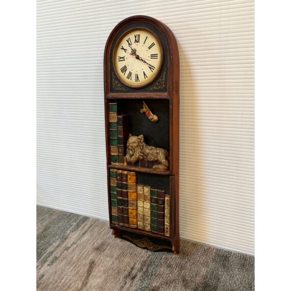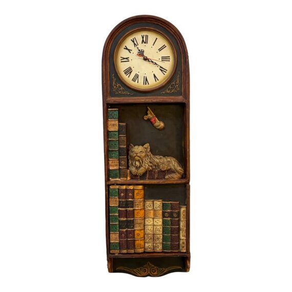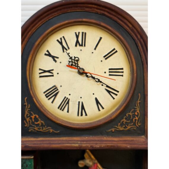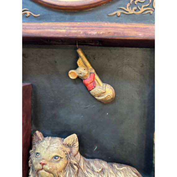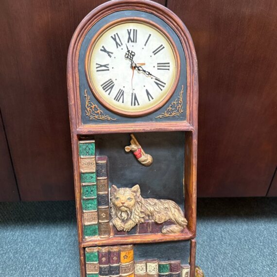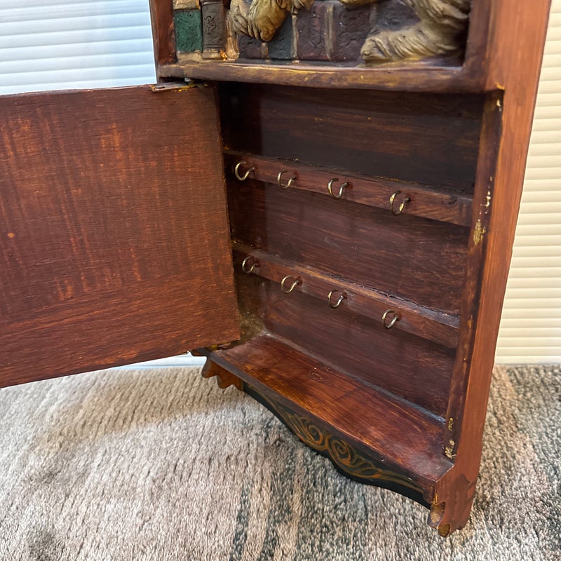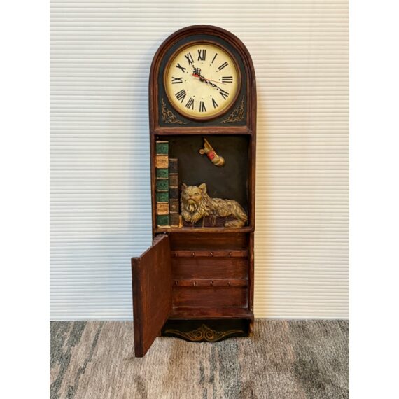Design Plus Gallery presents a Vintage Clock and Hidden Key Cabinet. Hang up your keys by the entryway and hide them away under this cute cat and mouse (pendulum) scene. Check the time time on the battery operated clock. Good condition for its age and usage.