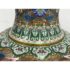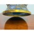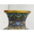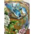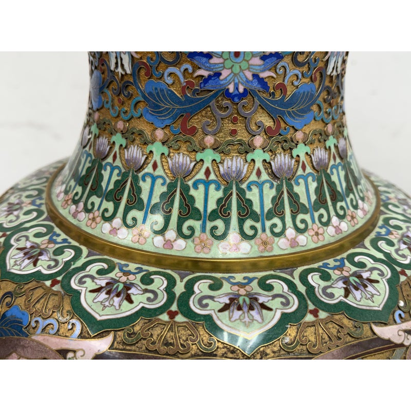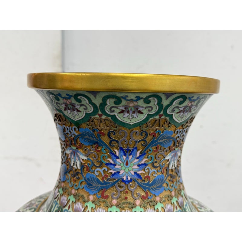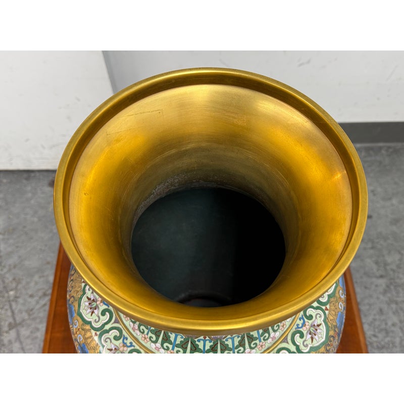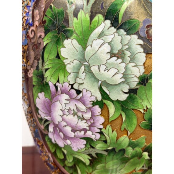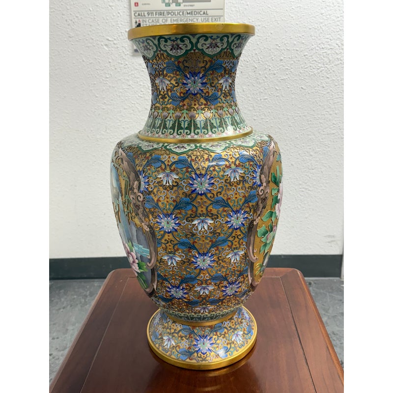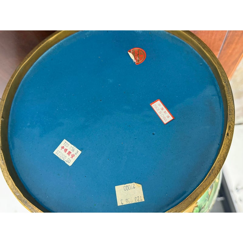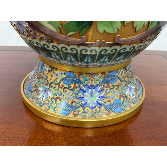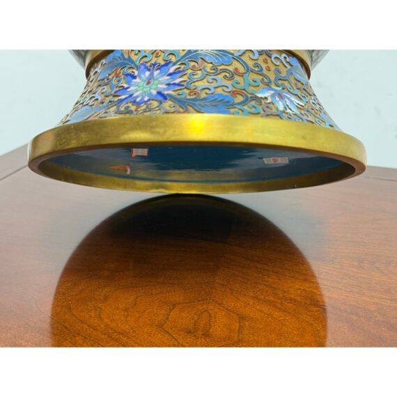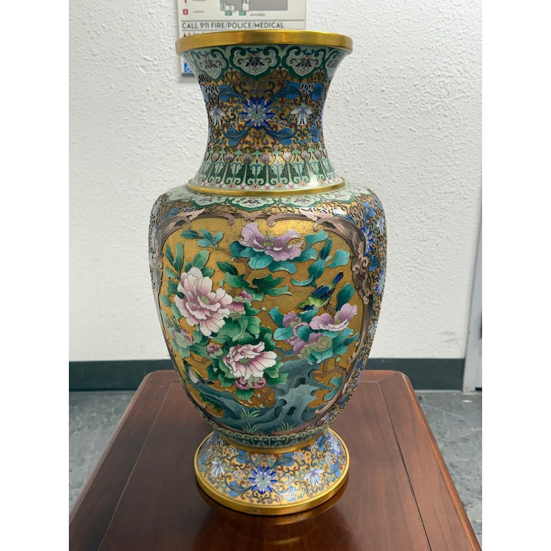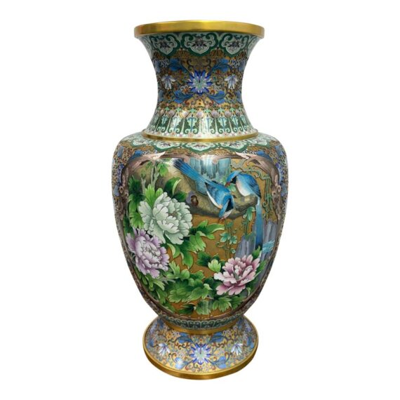 Design Plus Gallery presents a Cloisonné Vase of Blue Sparrows Resting in a Blossoming Tree in a Golden Backdrop. The vase is vintage in age and offers a bold arrangement of colors and detail work. Cloisonné is the technique of creating designs on metal vessels with colored-glass paste placed within enclosures made of copper or bronze wires, which have been bent or hammered into the desired pattern. The laborious process in which this vessel of colors, patterns and design is a piece of art that will be cherished in your home for decades to come.