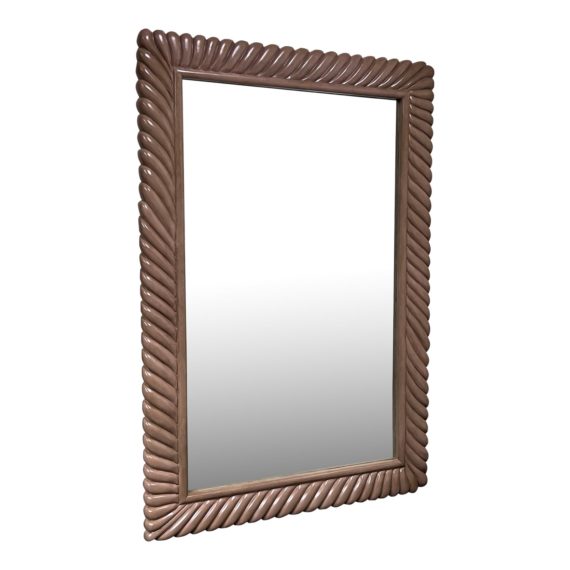 Design Plus Gallery presents a Wall/Floor Carved Pleat Mirror of Vintage Coastal Feel. The carved detailing around the mirror is elegant and has a smooth clear lacquer to protect the beautiful wood work. In good condition with minimal wear.