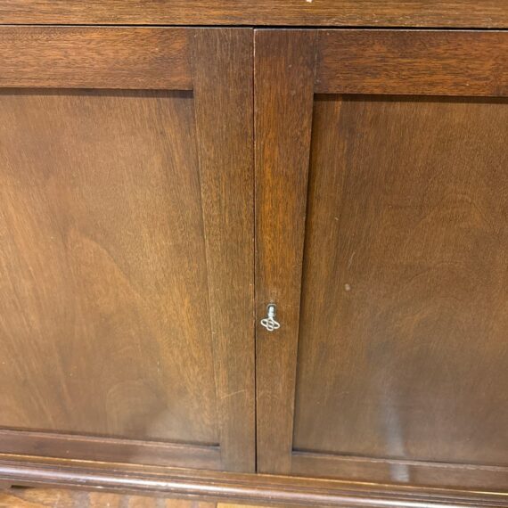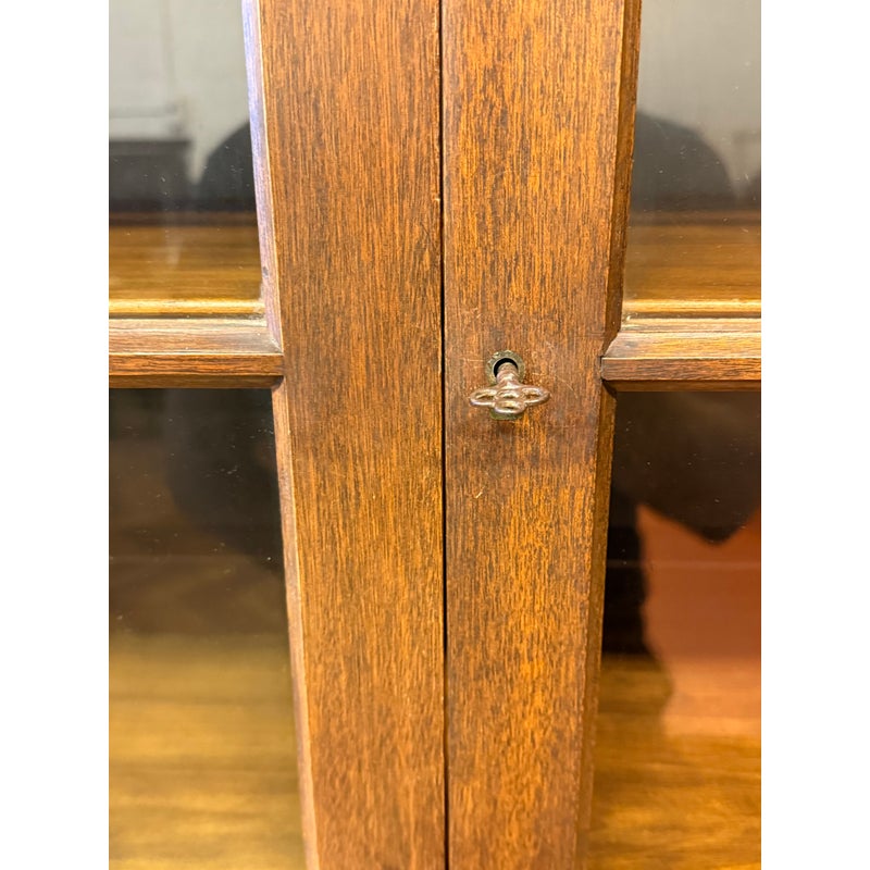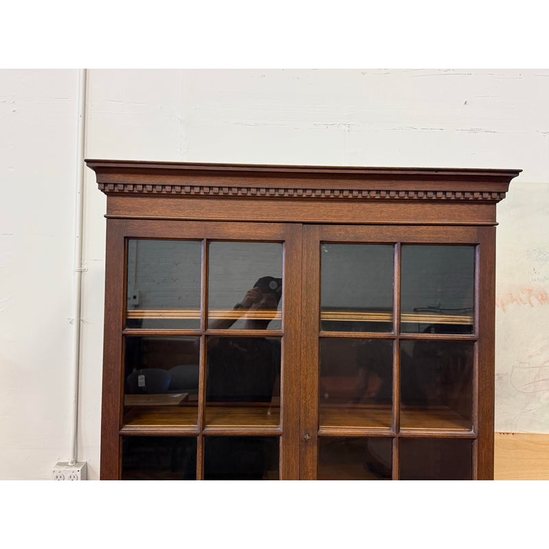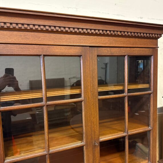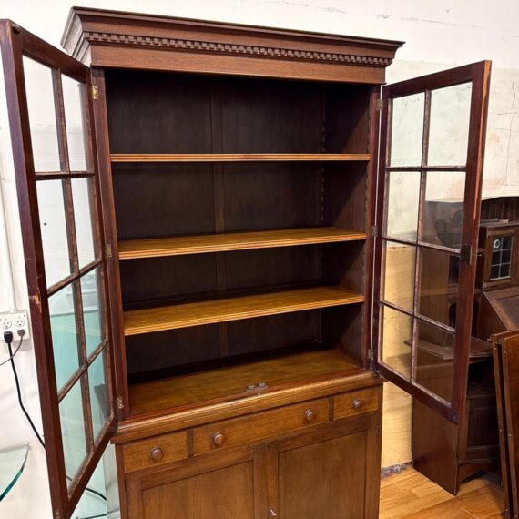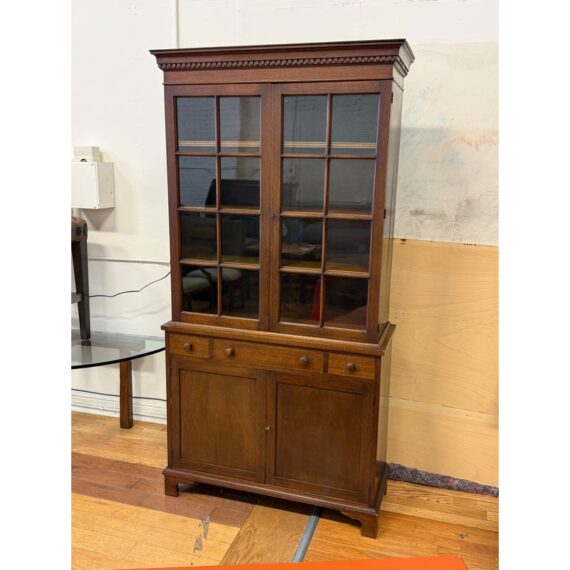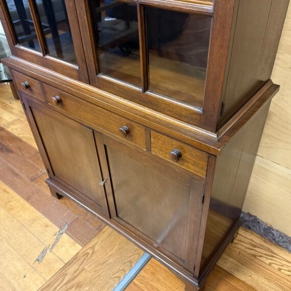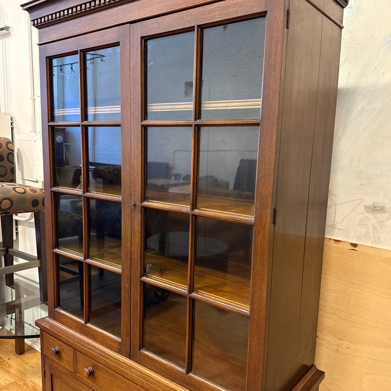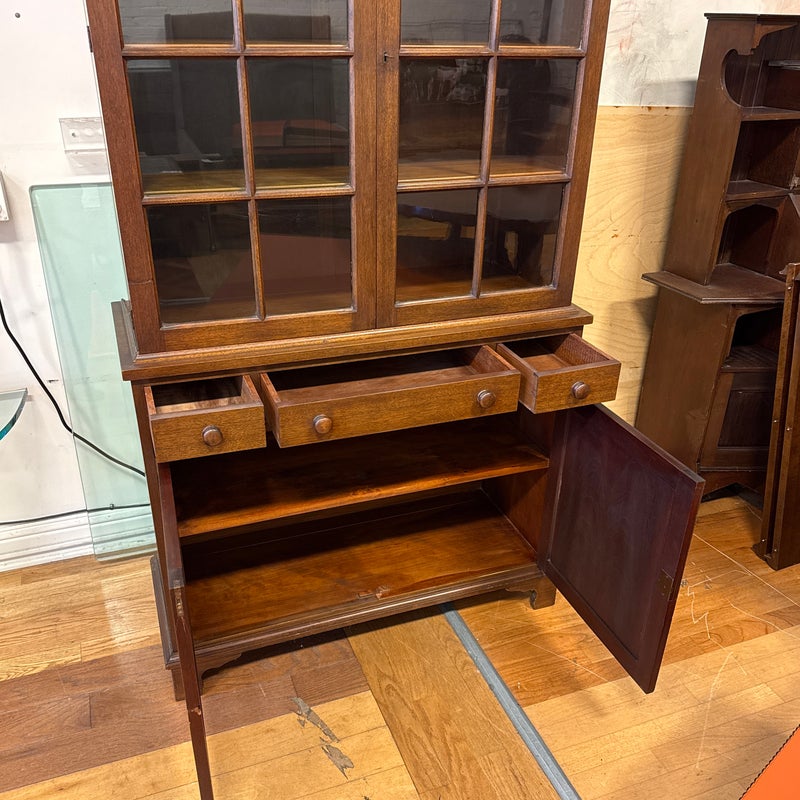 Design Plus Gallery presents a Glass Doored Cabinet + Solid Wood Frame China Cabinet of Vintage Age. Reminiscent of Colonial era pie cabinets that would allow a warm place to cool down baked goods and keep them free of pests. More modernly they were created to store china, you can have your pick with that and more with its ample storage. The attractive cabinet has a fine checkered border around its molding. The paned glass doors open to reveal three shelves and there are also three drawers below; two equal + small with one large center drawer. The bottom section offers a single drawer to split the open cavity. All shelves can be removed and placed according to needs. Is in good condition for vintage age with visible surface wear that is consistent with use.