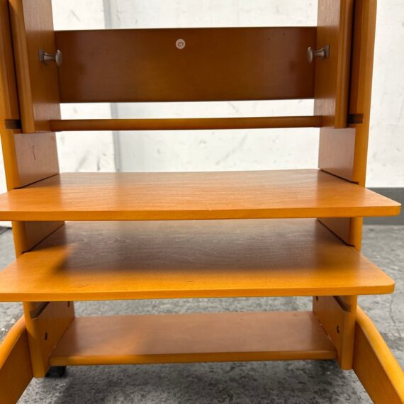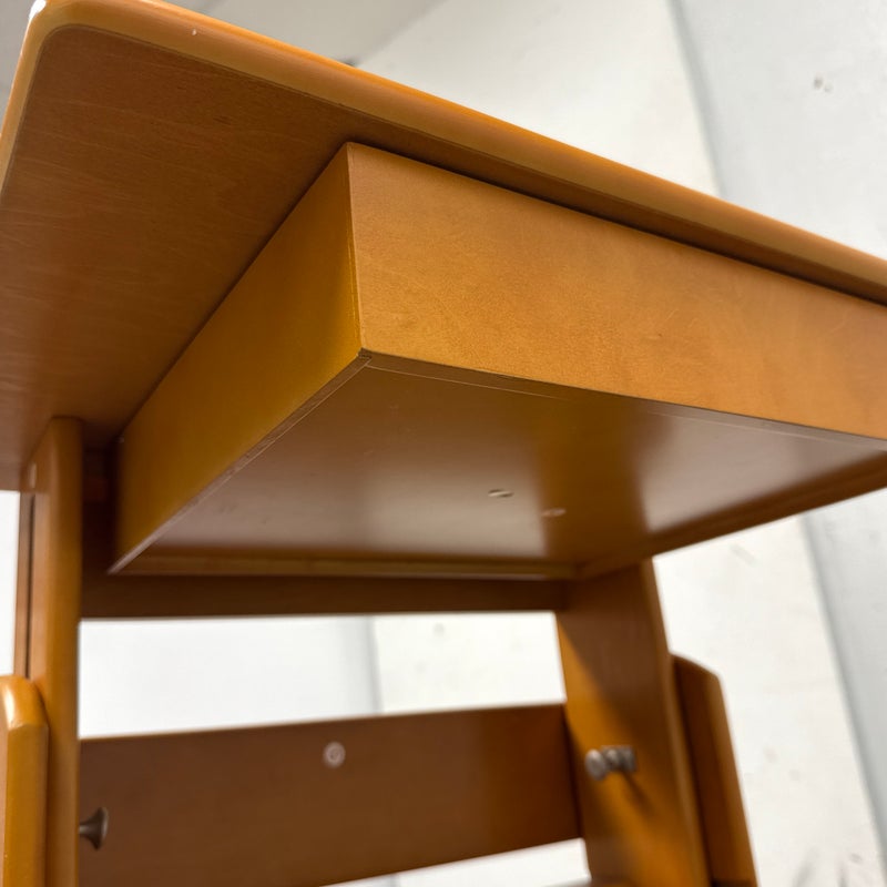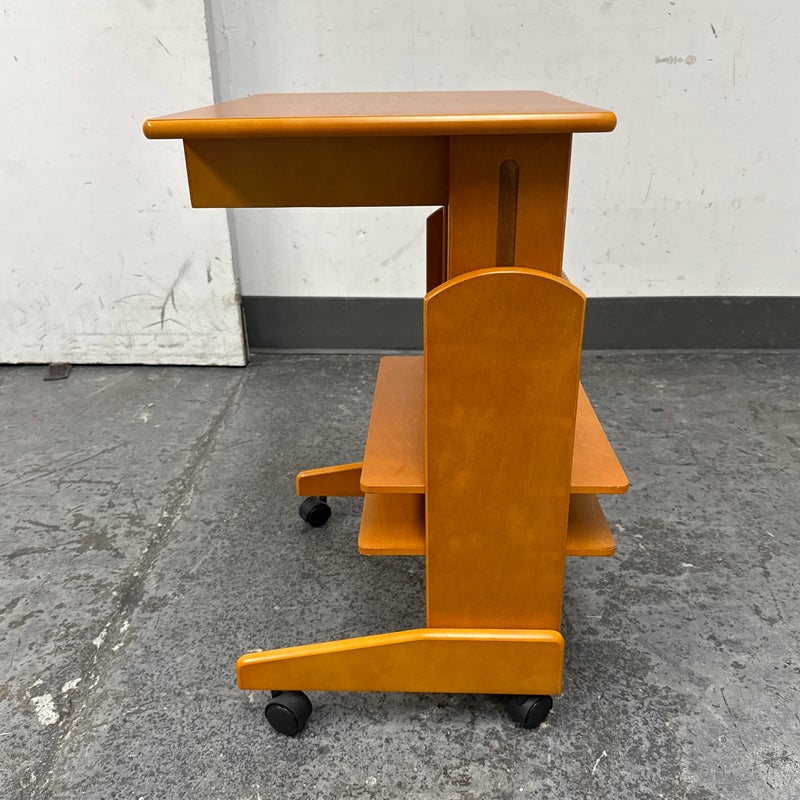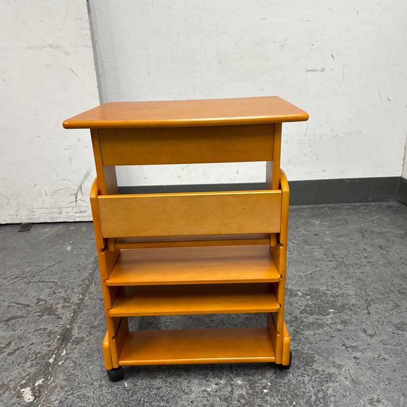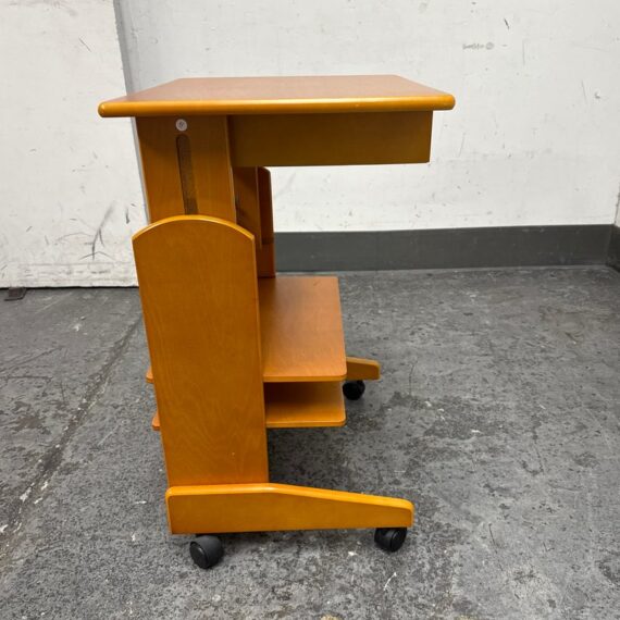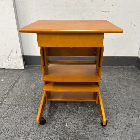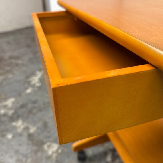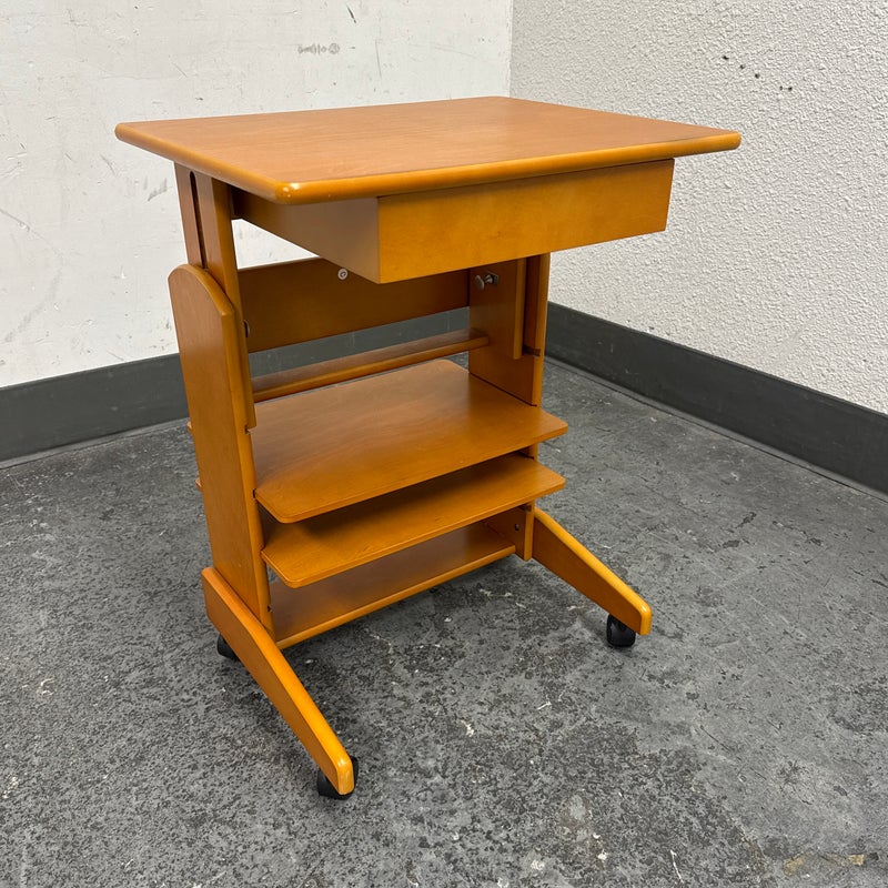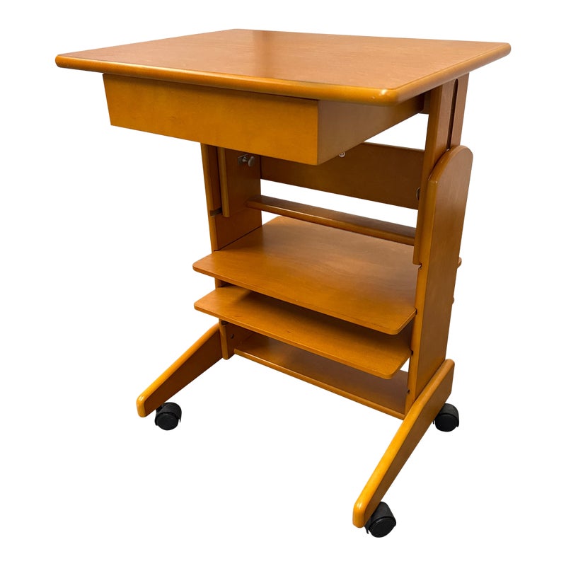 Design Plus Gallery presents a Vintage School Desk. The desk has a cute petite + narrow size, perfect for most rooms. There is a a single drawer + two removable/adjusting shelves. The desk legs are ended with casters for easy mobility between rooms for study. In good condition, visible and minimal wear.