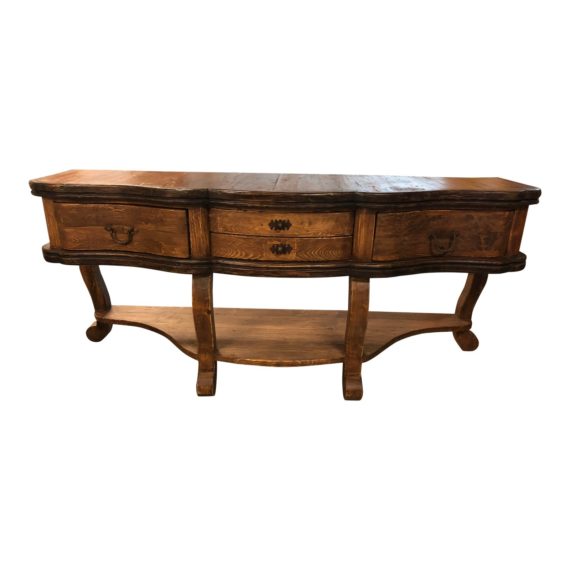 Design Plus Gallery presents a handcrafted wood console from Mexico. Constructed of solid salvaged wood with natural distress and aging. A curved front and curved legged beauty. A single mounted lower shelf. Two deep pullout drawers with two narrow middle drawers. The hardware is forged iron pulls and handles. A stunning piece to capture your guest attention.