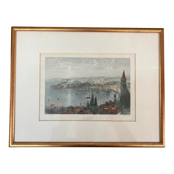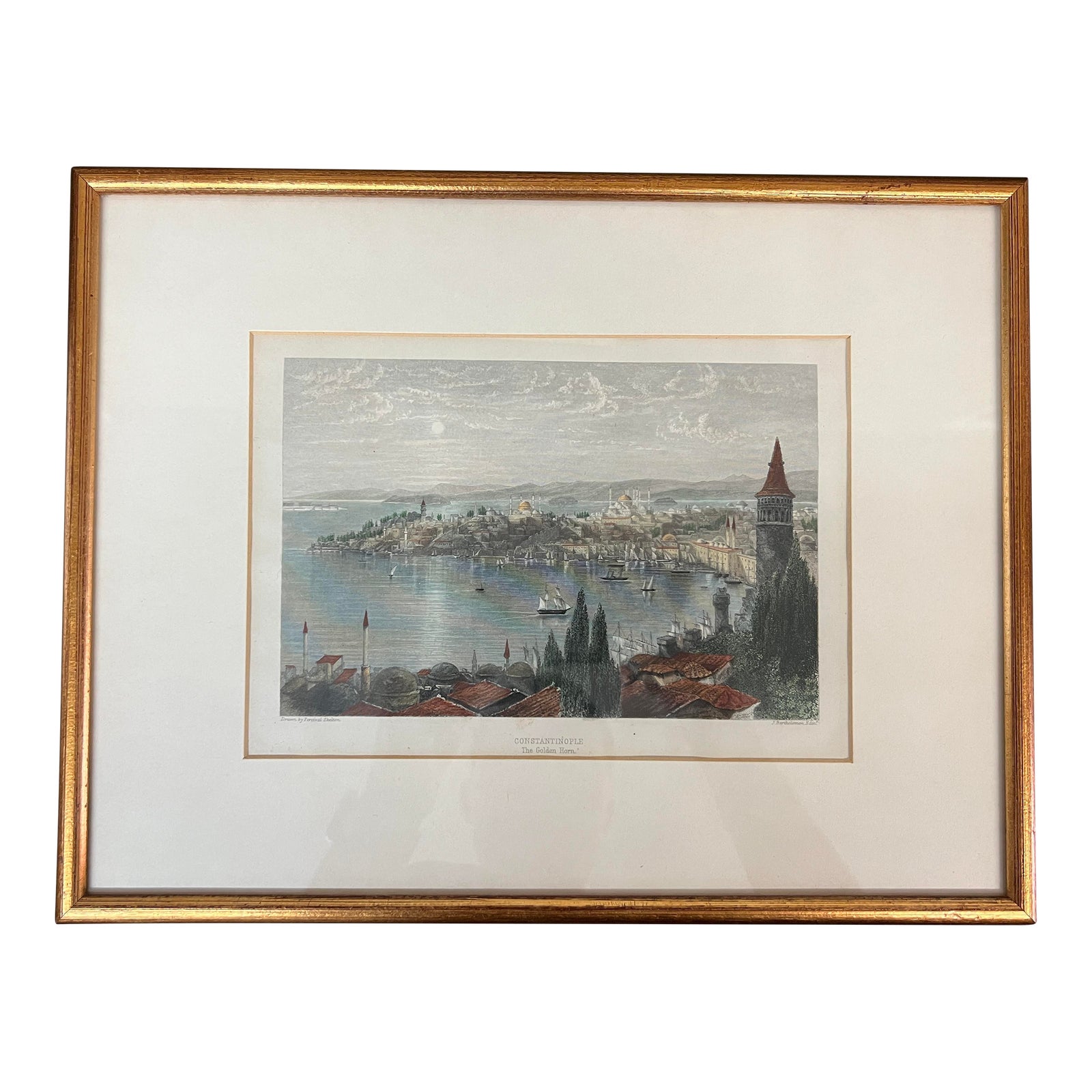 Design Plus Gallery presents a Vintage Engraving of Constantinople. Purchased decades ago in London, the beautiful seaside scene is a snapshot in time worthy of contemplation. Professionally double matted and framed in a slim gilt wood frame, to great effect. Little surface wear; condition is consistent with age and use.