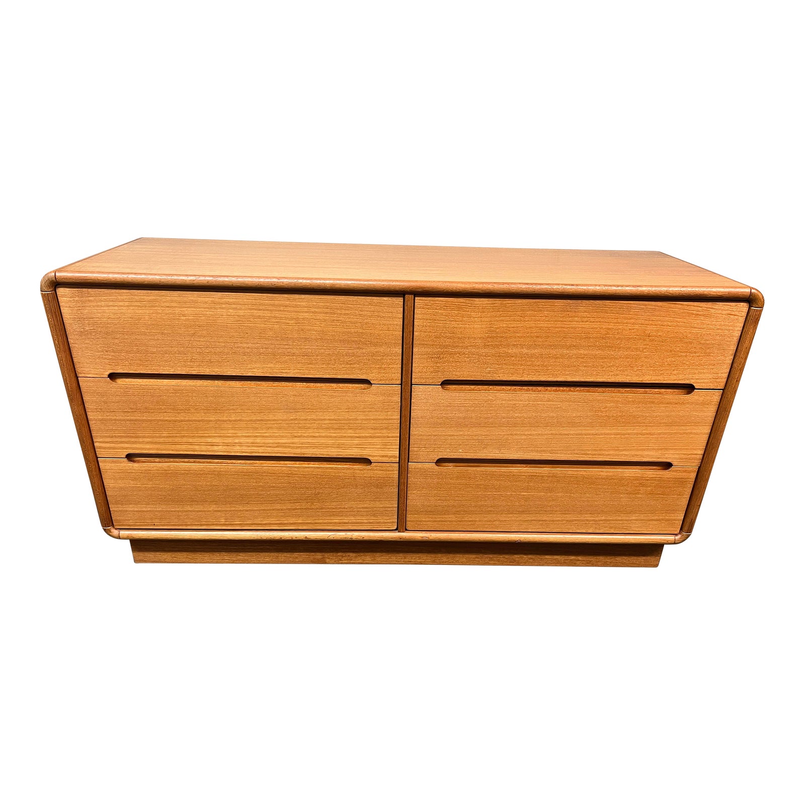 Design Plus Gallery presents a Vintage Teak Dresser. An organic modern silhouette, the six roomy drawers have integrated finger pulls rather than knobs, maintaining a sleek aesthetic. Elevated slightly, the dresser is simple and stylish. Light evidence of surface wear consistent with age and use.