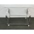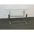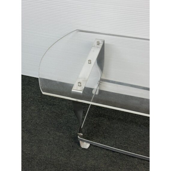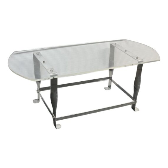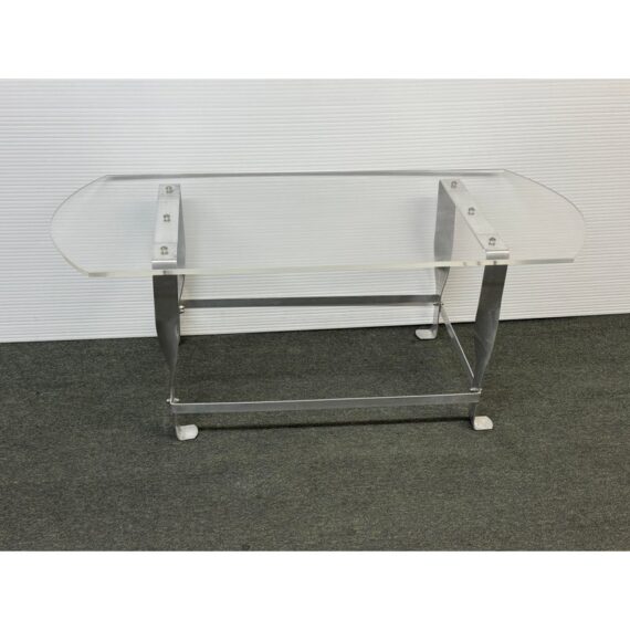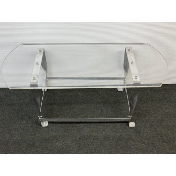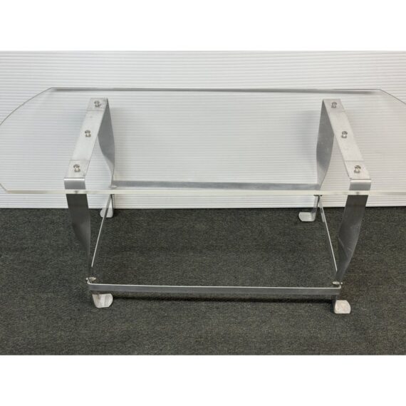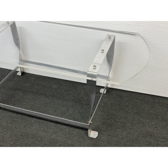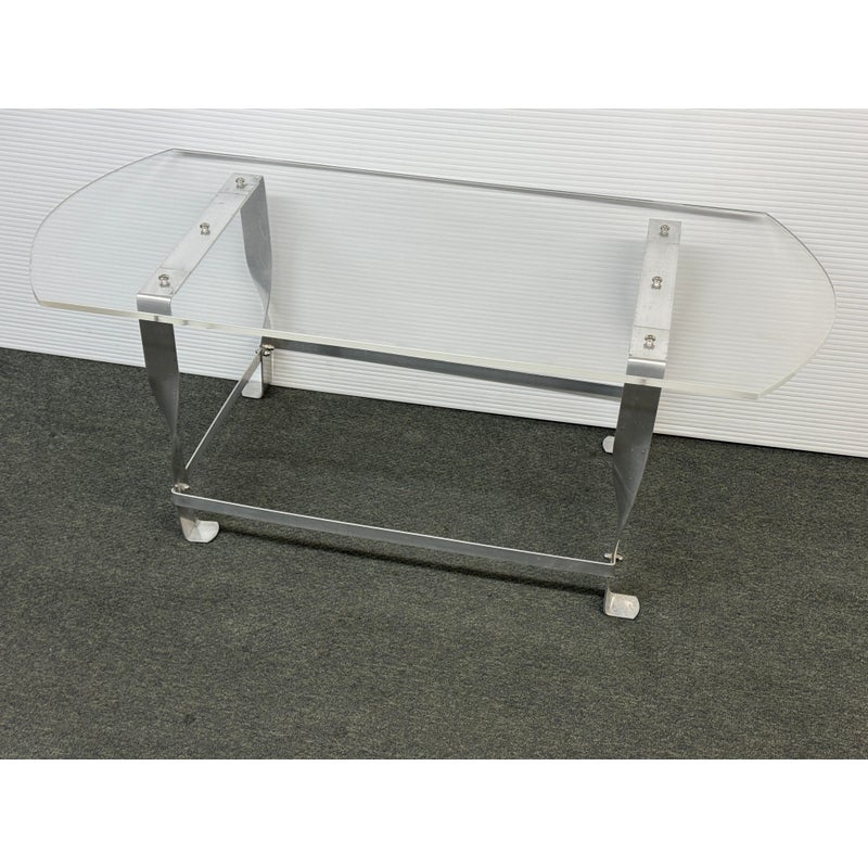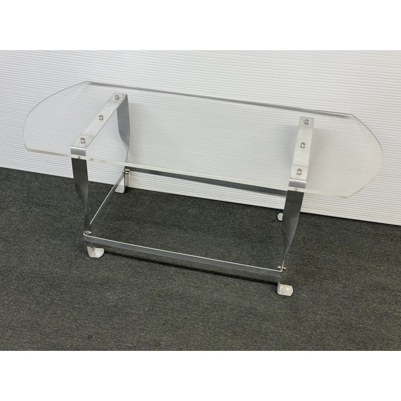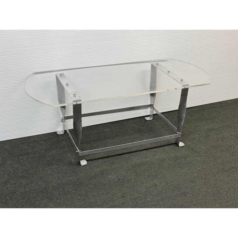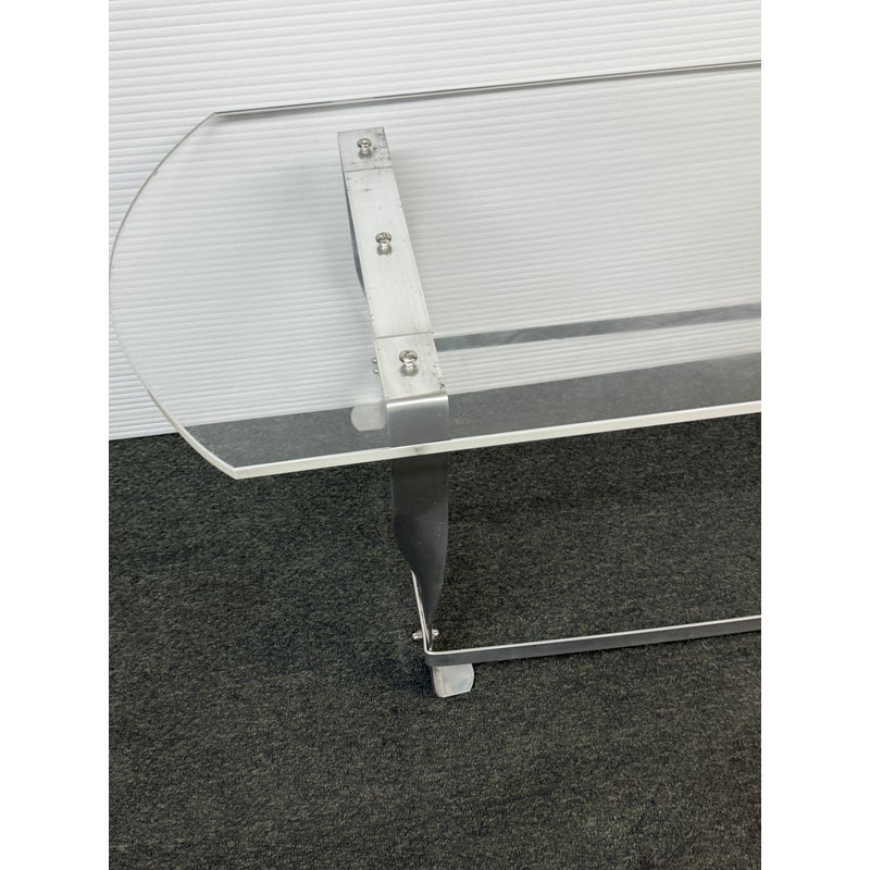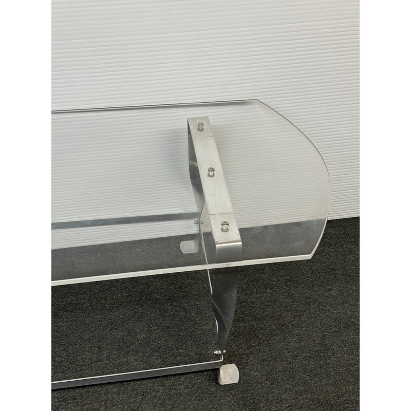 Design Plus Gallery presents a Vintage Custom Design Coffee Table. The tabletop is made of clear acrylic, shaped with a rounded edges on opposite sides. It is secured to the steel base with visible screws. The base is constructed from steel, with a design that includes twisted and curved supports connecting the tabletop to the rectangular base frame. In good condition, visible and minimal wear from usage.