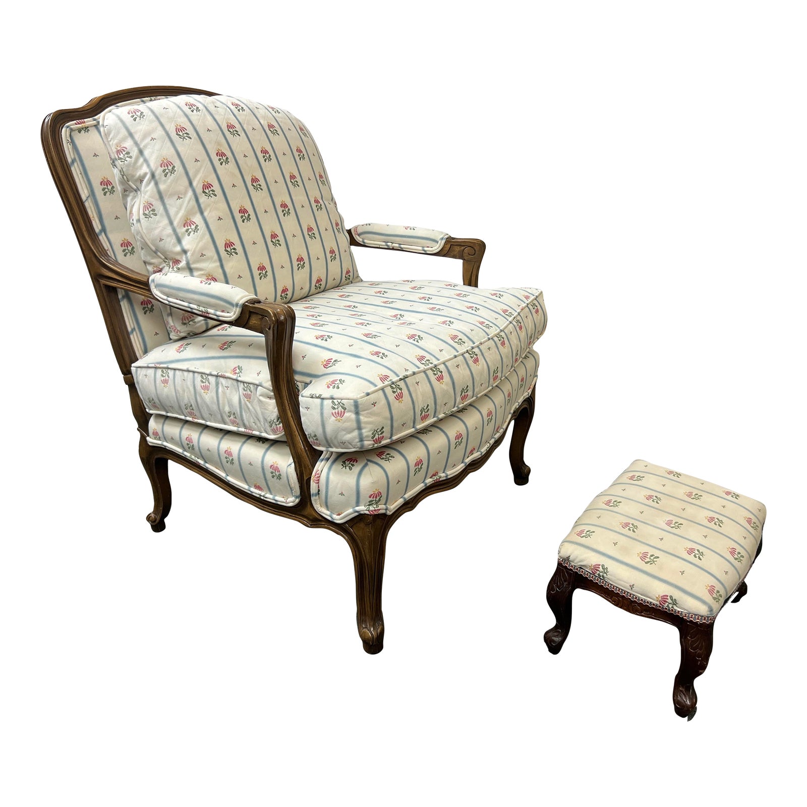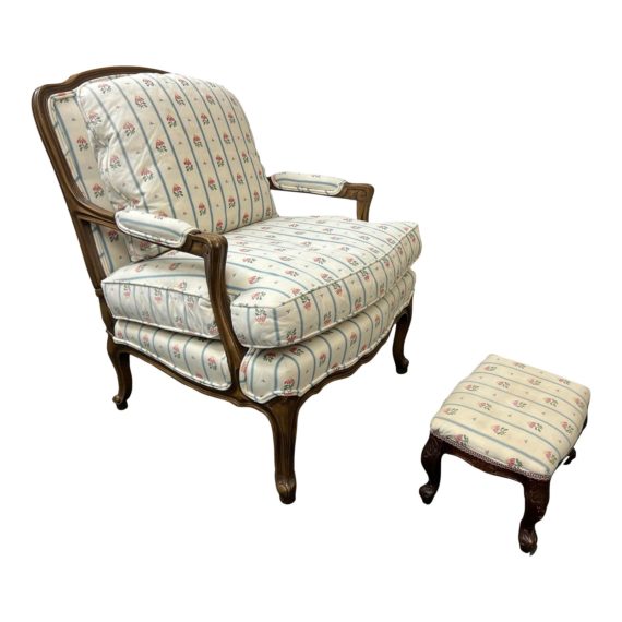 Design Plus Gallery presents a Vintage Custom Double Fabric Bergere Chair + Ottoman. The frames are constructed with wood. The upholstery has floral accents and is welted, doubly so on the chair’s body. The chair back is upholstered with a second fabric with a plaid pattern. The ottoman’s upholstery is slightly loose on one portion. Visible + minor wear consistent with age + use; set is in good condition.