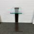 Design Plus Gallery presents a C-Style Table from the Design Institute of America in the 1970s. The table surface is a thick cut of tempered glass with surrounding the base stem of cast bronze finish metal. The table is meant to push under a chair, sofa or even bed frame for storage solutions and out of the way appeal. Is in good condition for its vintage age with light surface wear to the metal + glass that are consistent with usage. Made in the USA.
