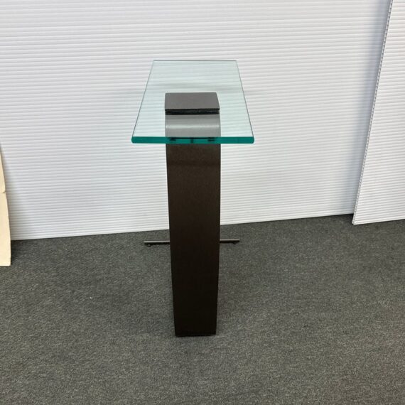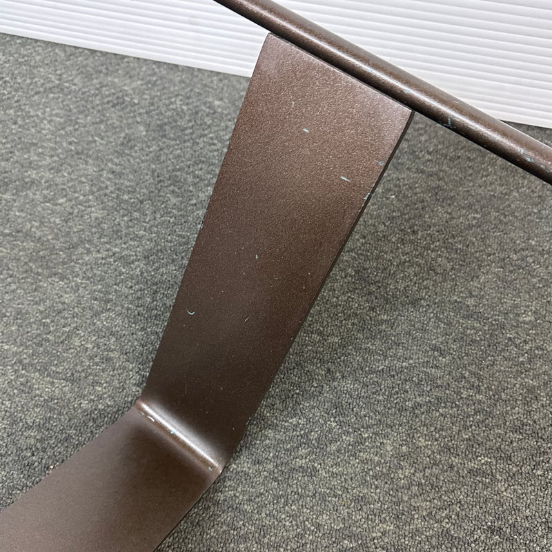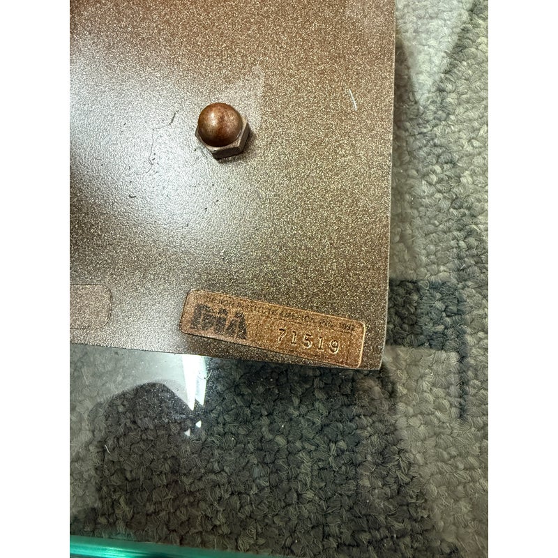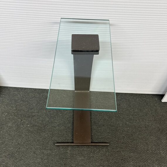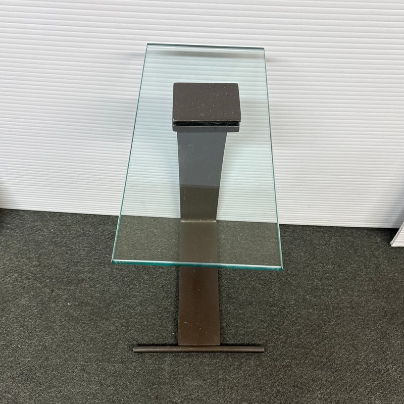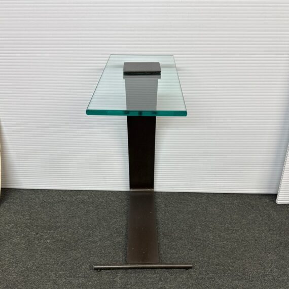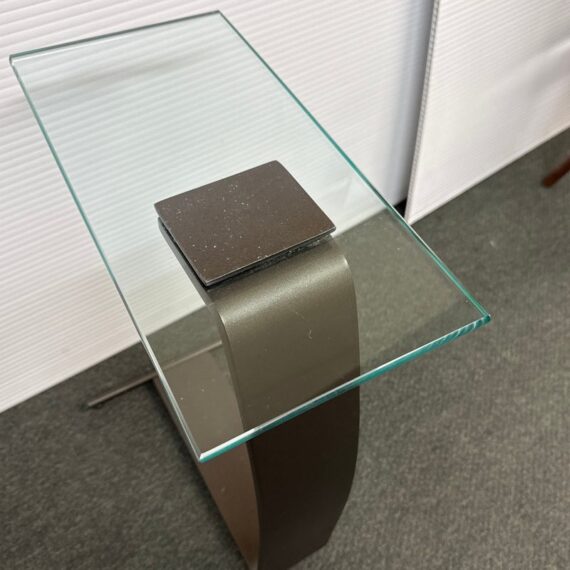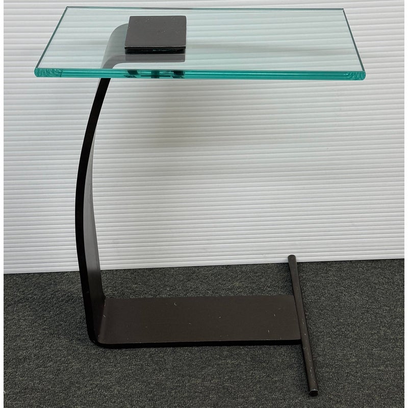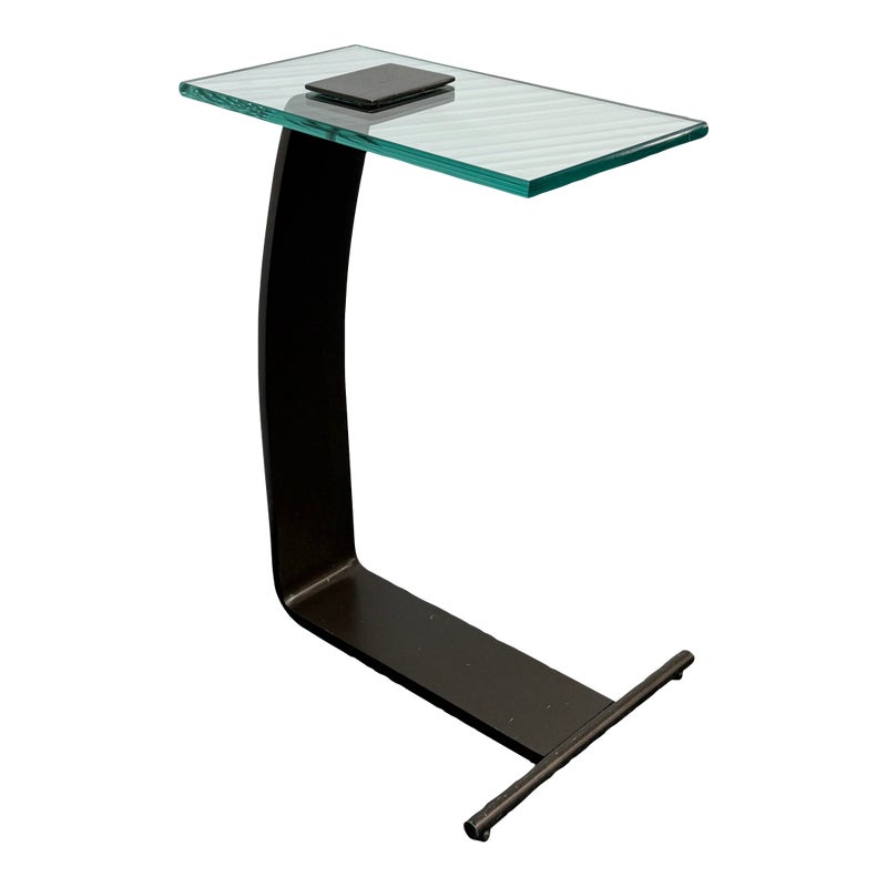 Design Plus Gallery presents a C-Style Table from the Design Institute of America in the 1970s. The table surface is a thick cut of tempered glass with surrounding the base stem of cast bronze finish metal. The table is meant to push under a chair, sofa or even bed frame for storage solutions and out of the way appeal. Is in good condition for its vintage age with light surface wear to the metal + glass that are consistent with usage. Made in the USA.