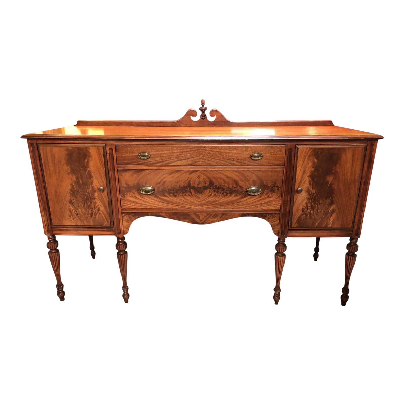 Design Plus Gallery presents a tall standing dining room buffet. Turned and reeded legs, brass pulls, and beveled edges show the attentive craftsmanship of this piece. Storage includes two center drawers and two side cabinets, one with a hidden silver drawer. Entertain in opulence and style with this shimmering wood grain buffet!