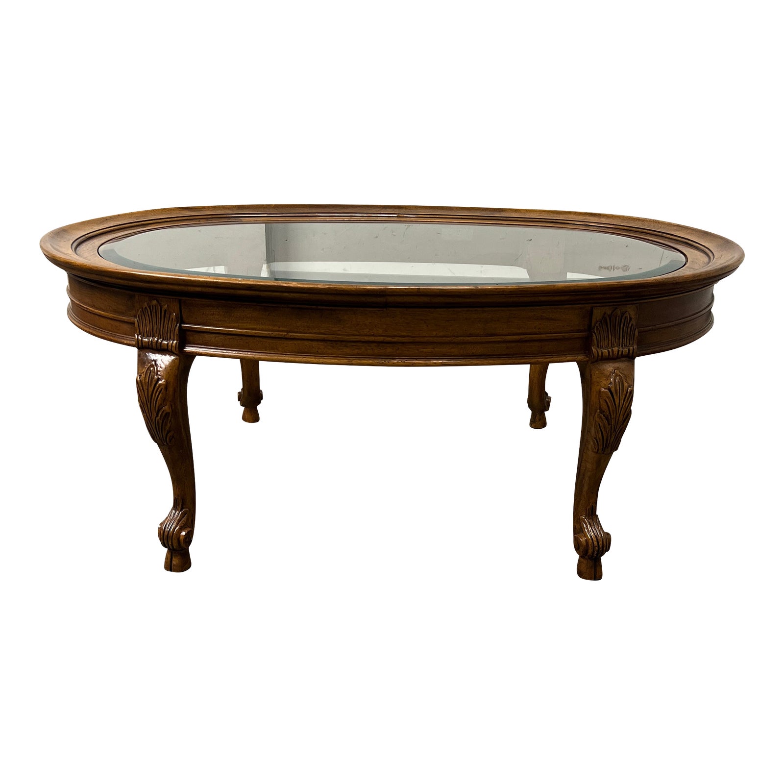 Design Plus Gallery present s Vintage #233-145 Grand Tour Cocktail Table by Drexel Heritage. The oval shape of the coffee table provides a unique and stylish alternative to traditional rectangular or square tables. The oval frame adds a touch of elegance and sophistication, while the four cabriole legs with intricate carvings offer a classic and refined appearance. These beautifully detailed legs not only provide stability and support but also serve as a decorative element, adding a touch of charm to the overall design. This glass insert also acts as a functional element, providing a smooth and easy-to-clean surface for placing drinks, books, or other decorative items. Size is perfect for small living spaces, serving as a central focal point in the room. Visible and minor wear from usage + age. Natural distress.