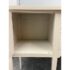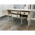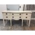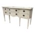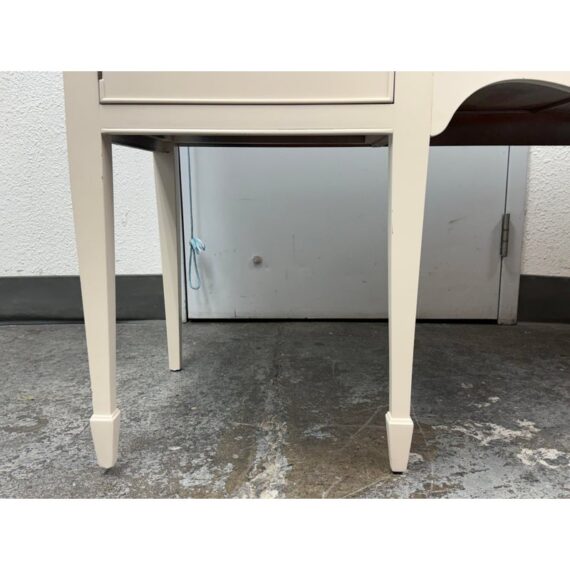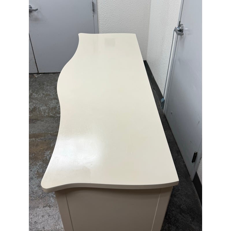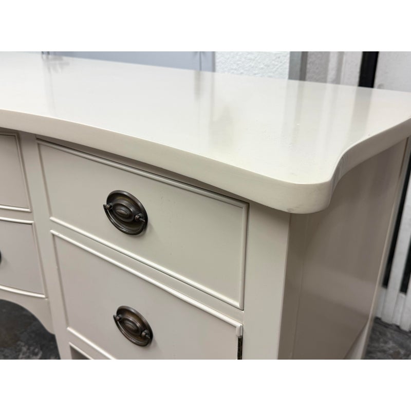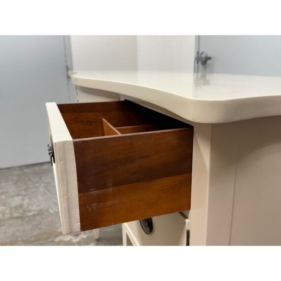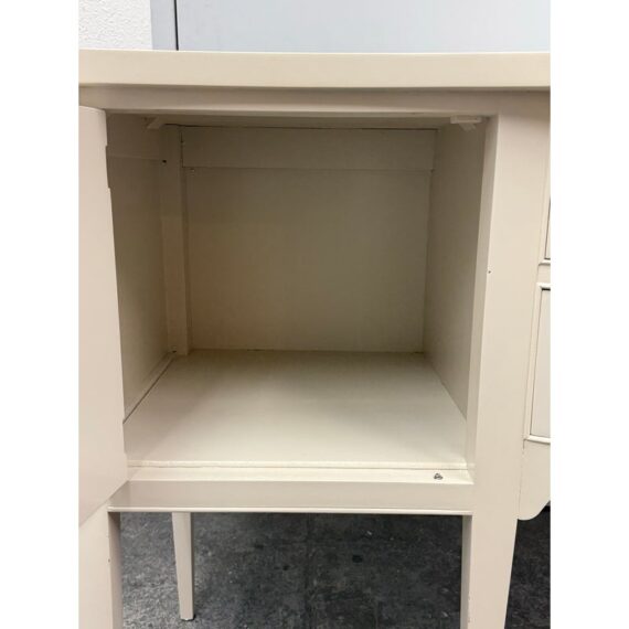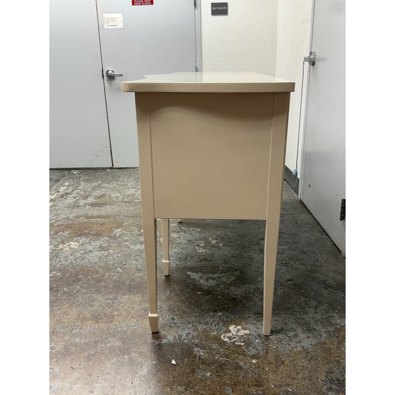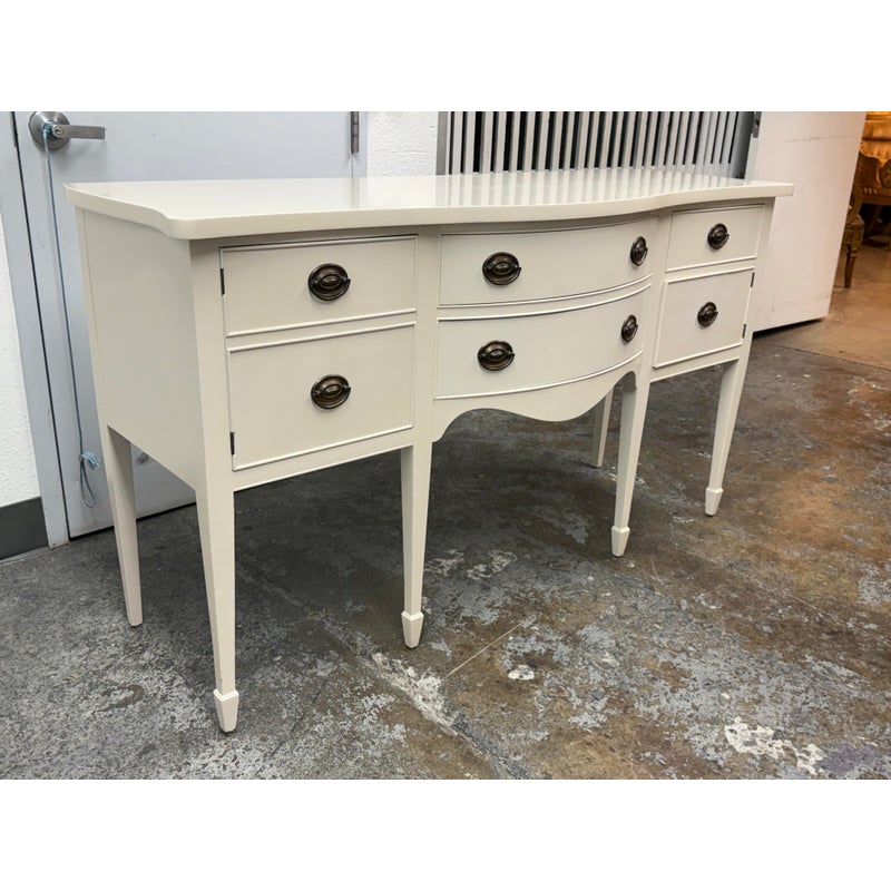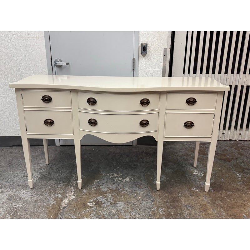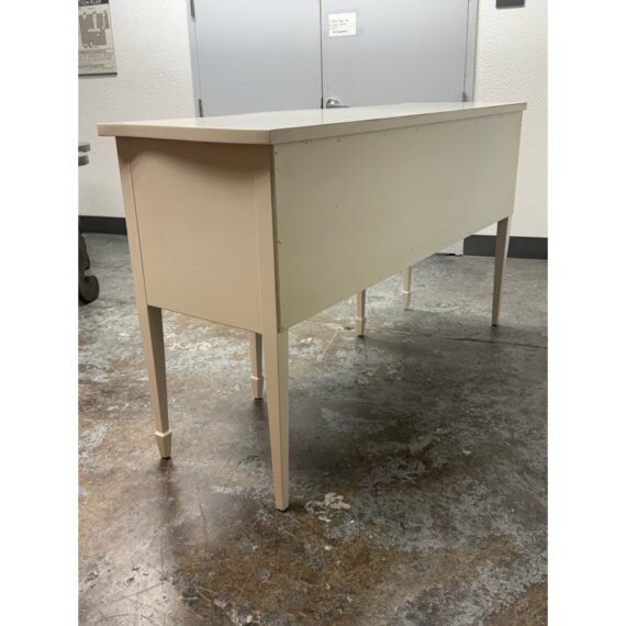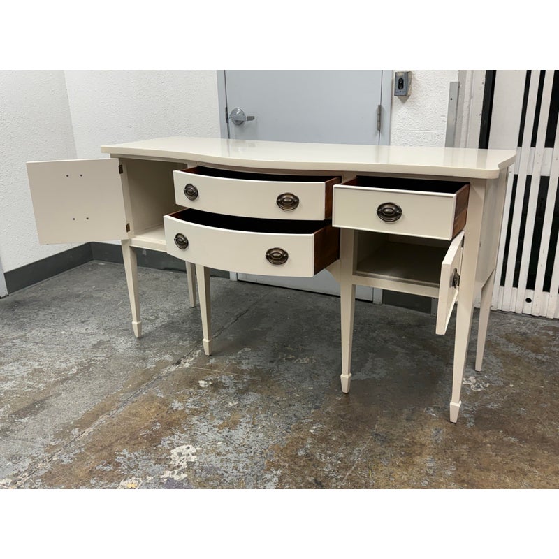 Design Plus Gallery presents a Credenza from Drexel. A truly becoming piece for your home to functionality that will improve any room it is placed in. The piece has a nice cream tone, like ecru or eggshell with antique brass hardware. There are two center drawers with an open cubby on the left side and a single drawer with cubby door on the other side. It rests on six tapered legs with the four front ones have pointed, dagger ends. The brand plate is within a drawer and no longer in production. It is in good condition, visible and minimal wear for its usage. Made in the USA.