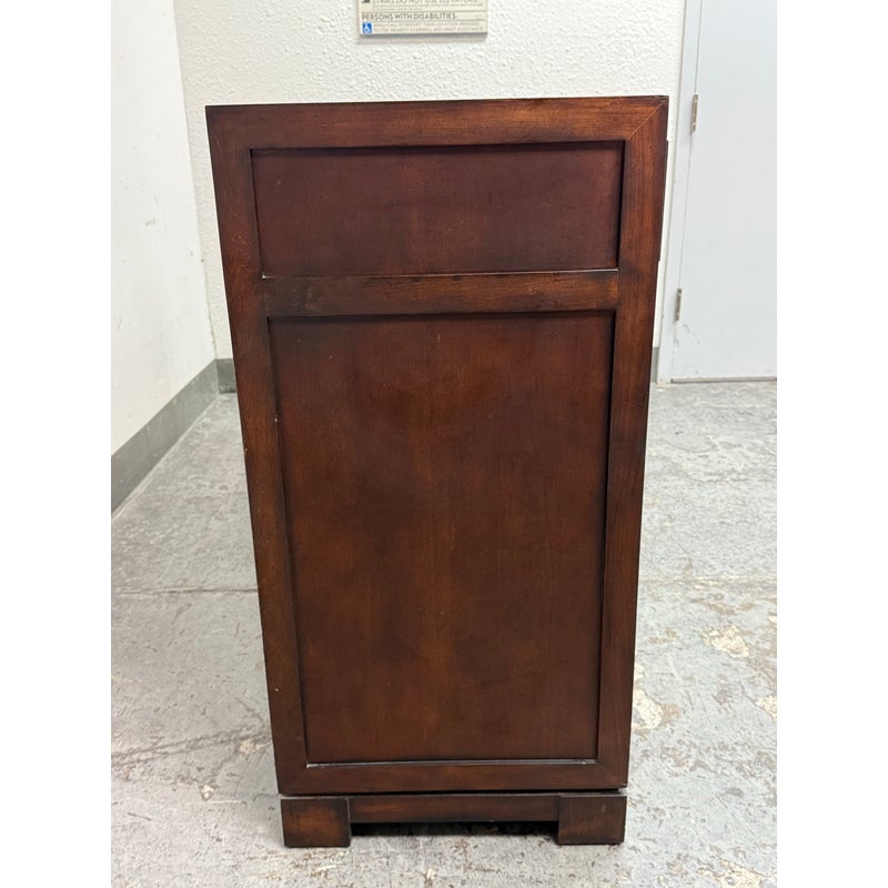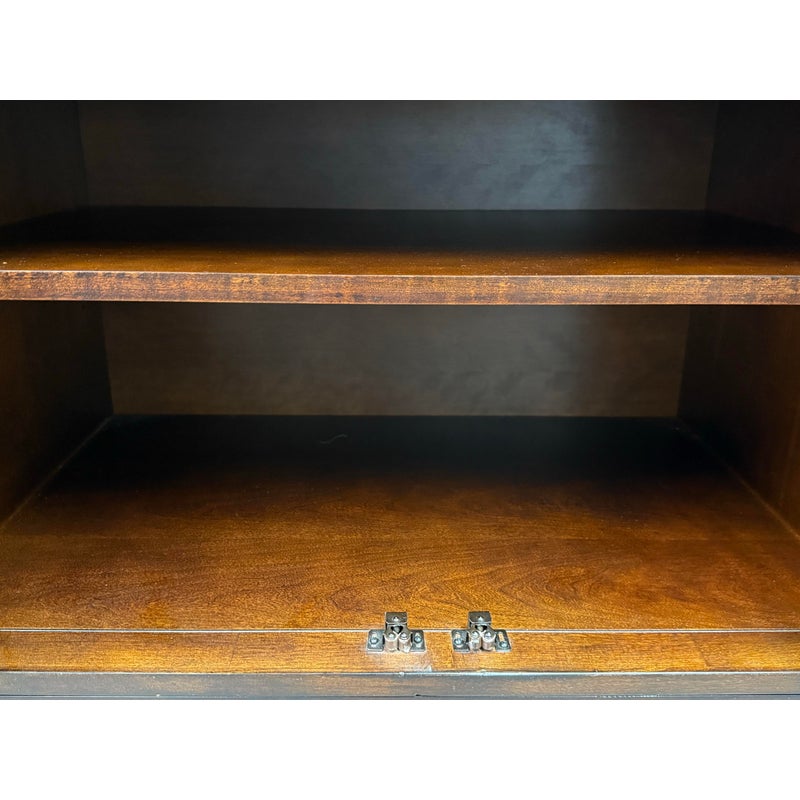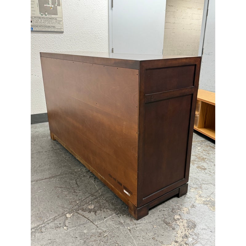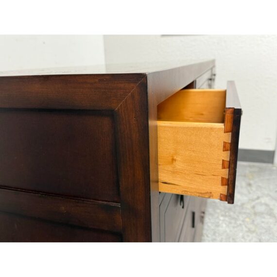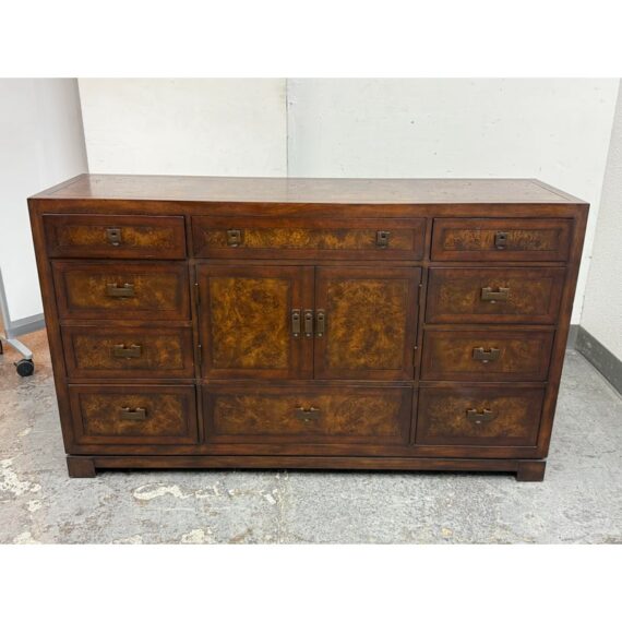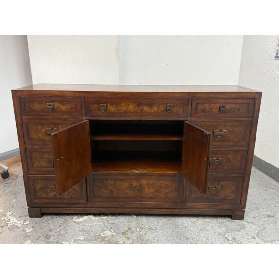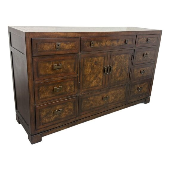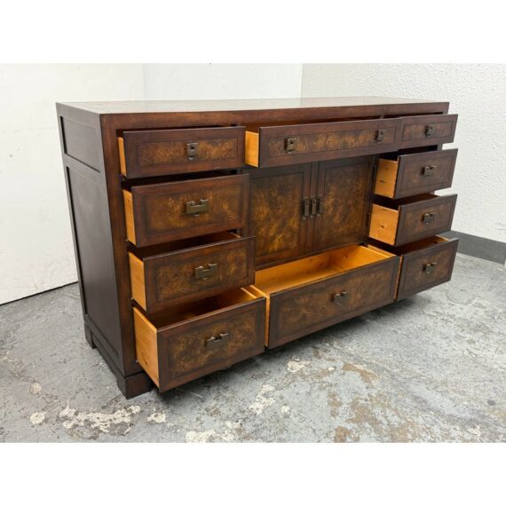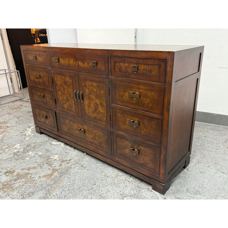 Design Plus Gallery presents a Chinoiserie Credenza in a Vintage Dynasty Style. The credenza is designed with Asian inspiration that has two different wood finishes and antique brass hardware. There are ten dovetailed drawers of varying sizes and shapes with an open middle cubby with interior shelves. The make and model of this credenza or dresser are unknown but it is in good condition with minima visible wear for its usage.