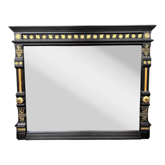 Design Plus Gallery presents a Vintage Eastlake Style Wall Mirror. A rectangular mirror is secured in an ornate frame constructed with wood. The wood frame has a black finish and is adorned with gold accents: botanical, floral and a touch of geometric. The sides have a post appearance. The top and bottom of the frame have multiple tiers; the top’s tiers have rounded edges. The mirror has some marks from being time-loved. Visible and minor wear from age and use; mirror is in good condition.