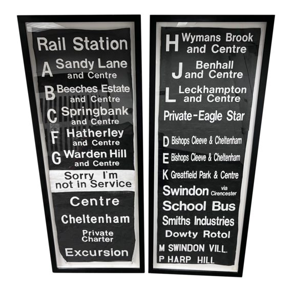 Design Plus Gallery presents a Pair of Vintage Busblind Rolls. Displayed at front of the bus, the rolls would display each of the stops on the route. Addresses are printed in white agains black for visual impact. The Pair have been professionally mounted and framed in slim black frames to great effect. Light evidence of wear consistent with age and use.