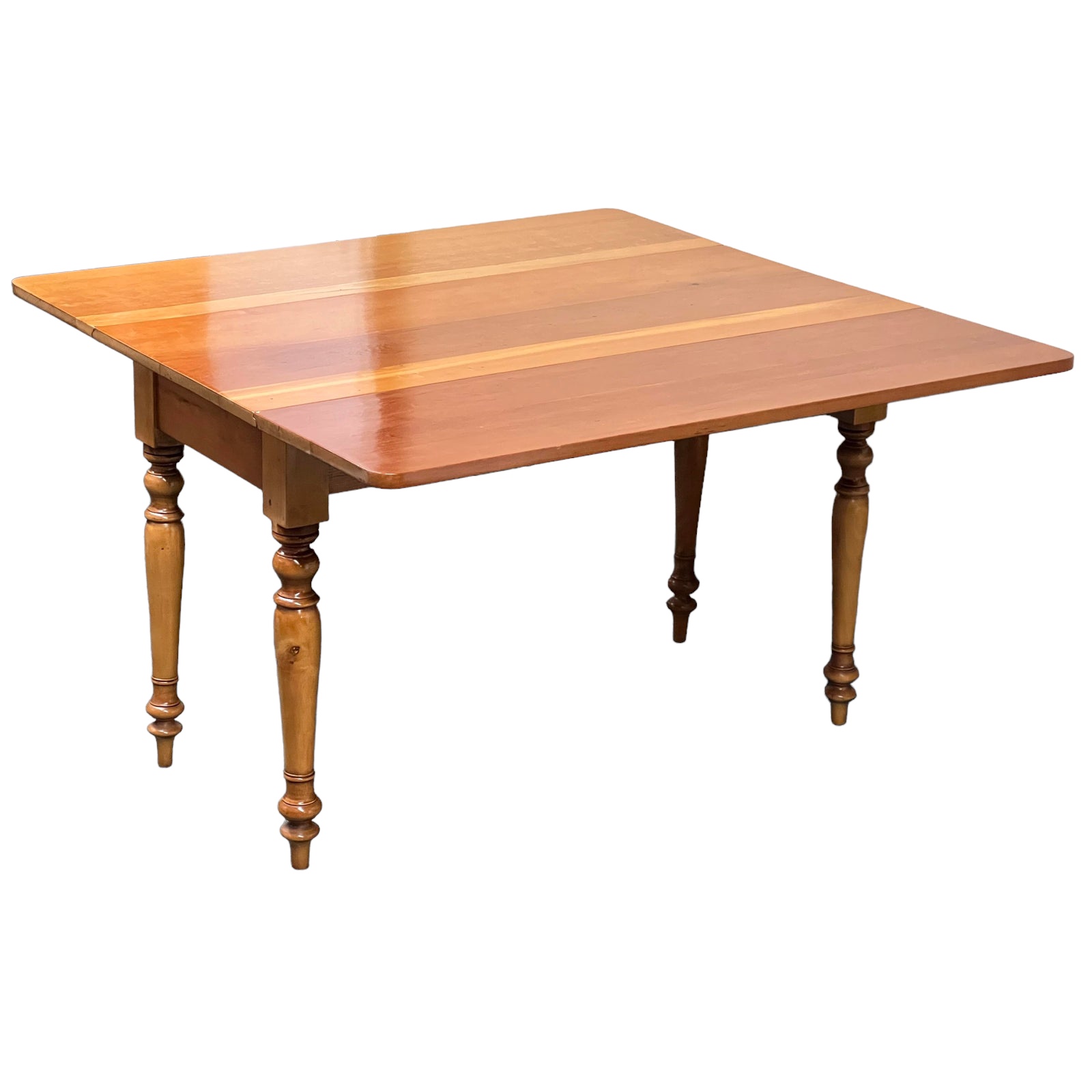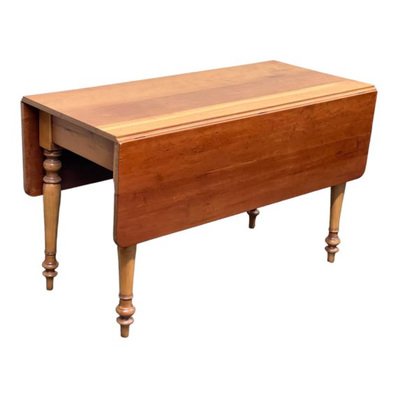 Design Plus Gallery presents a Vintage English Dropleaf table. The charming solid wood table has lovely turned legs that elevate the wide plank, curved corner surface. Time and light has created an ombre effect with the color of the woodgrain moving from light to dark, otherwise good condition.