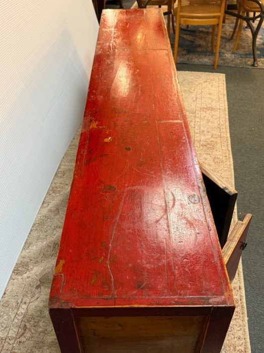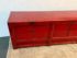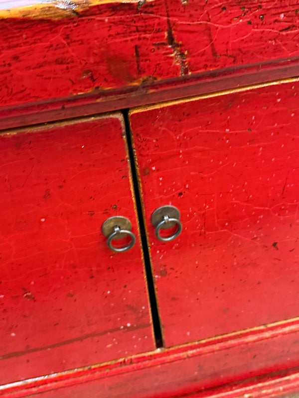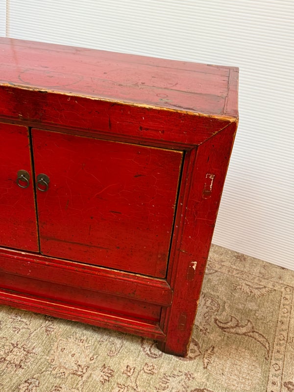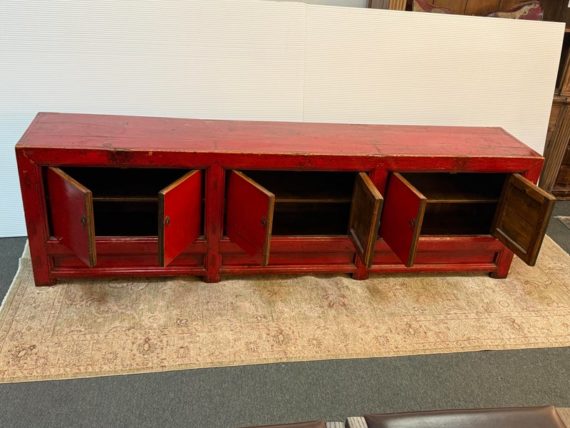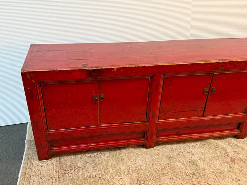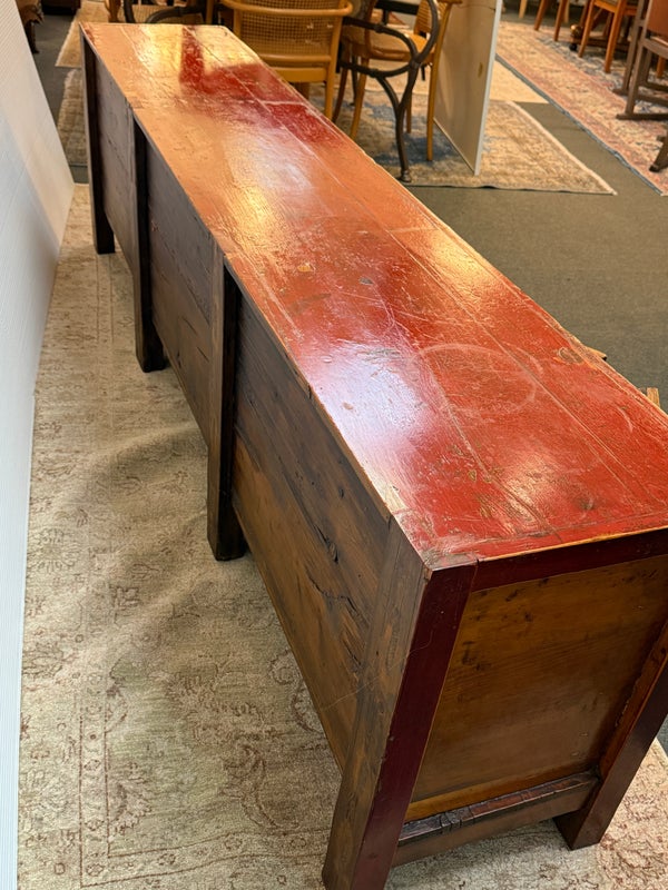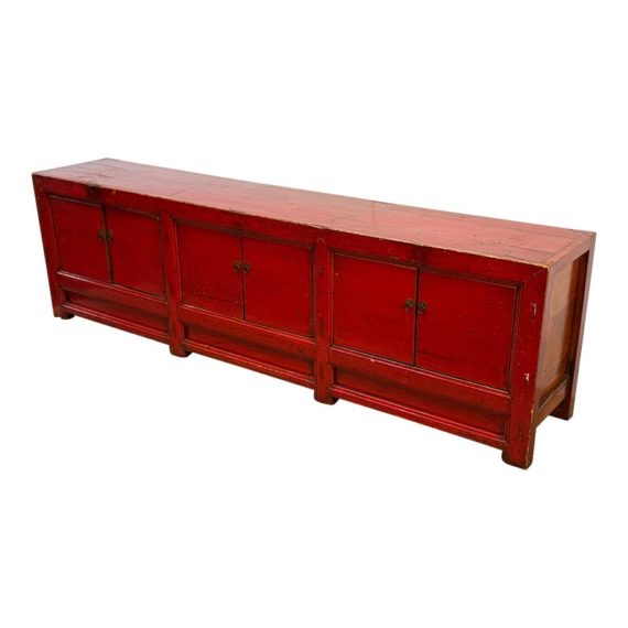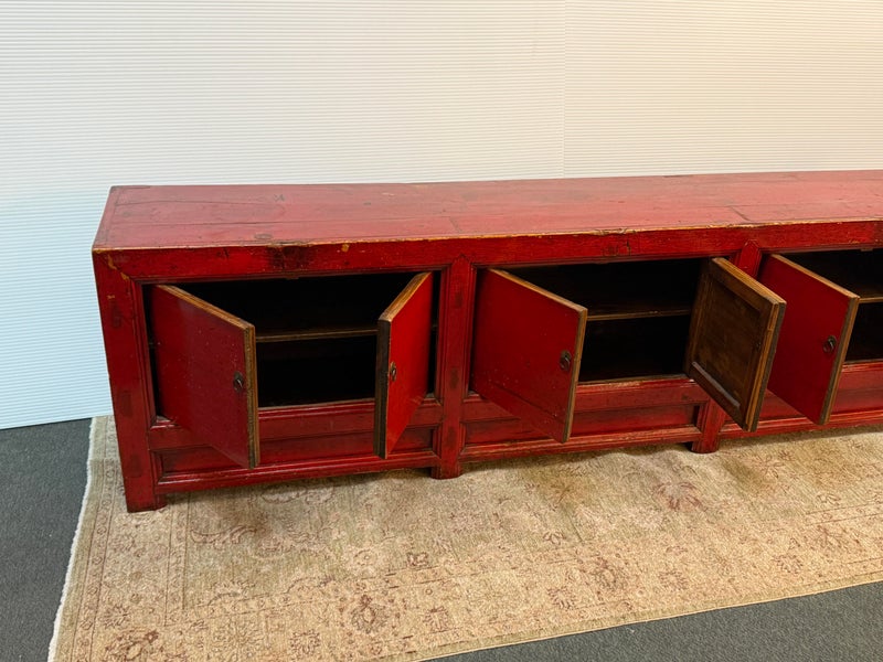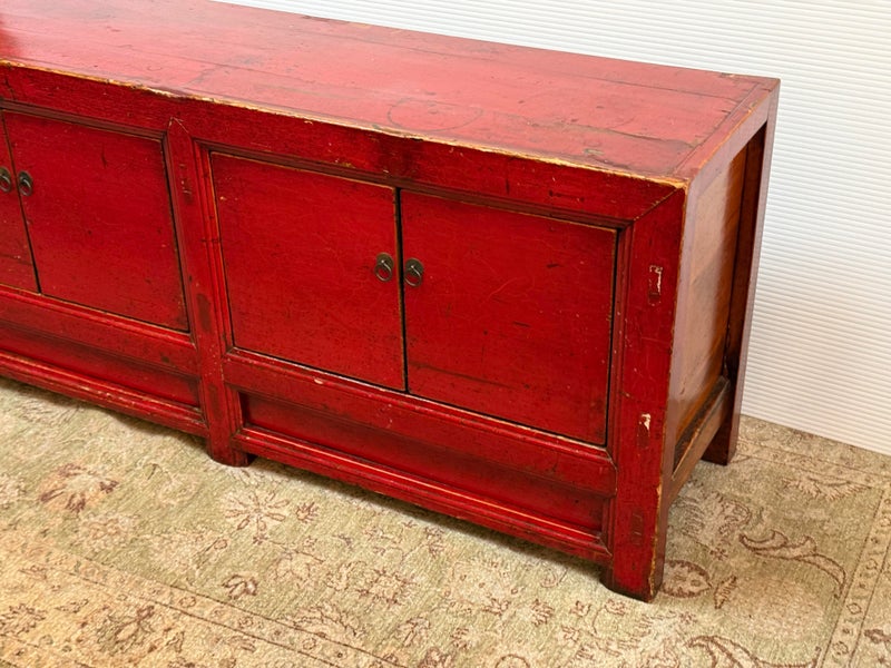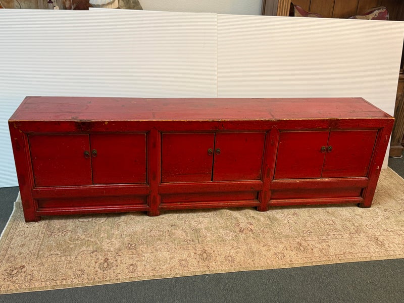 Design Plus Gallery presents a Vintage Asian Low Cabinet. The large length of this lovely cabinet is accentuated by the distressed red lacquer finish. Three sets of doors open to adjustable shelving that allows for ample storage.Size and scale makes it a wonderful entryway piece or media cabinet. Distressed finish intentional; condition is good for age and use.