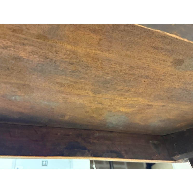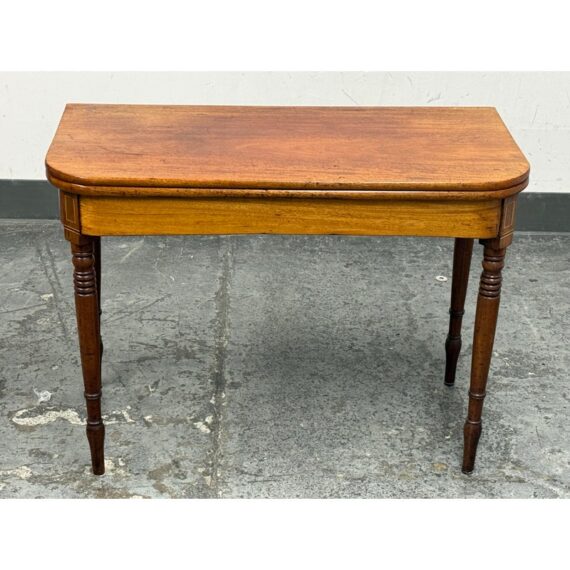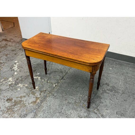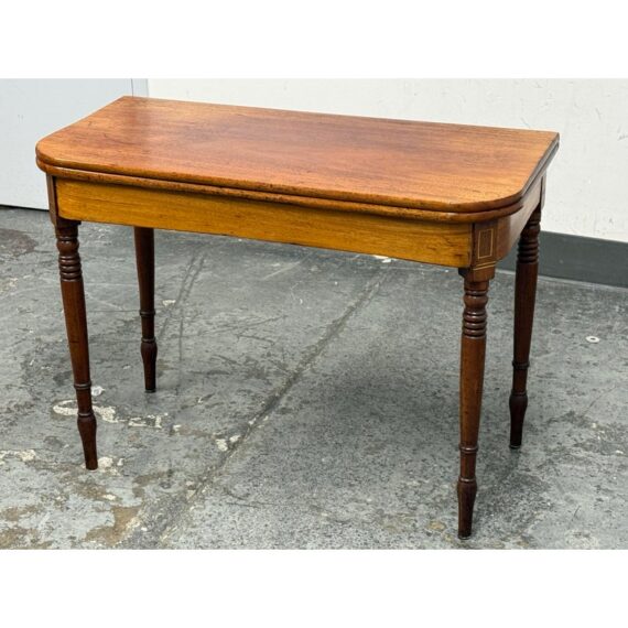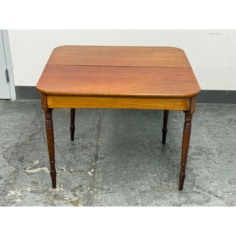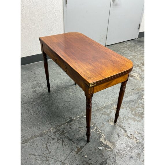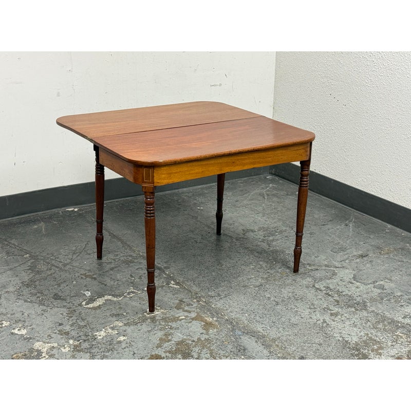 Design Plus Gallery present an Vintage Wooden Flip-Up Extension Table. The console table features rounded corners, turned legs, and a gateleg support that stabilizes the flip-up extension. The top displays natural grain variation and a timeworn patina, and the apron includes subtle corner inlay detailing with visible brass hinges at the leaf edge. The gateleg action opens and closes smoothly, and the proportions remain clean and balanced in both positions. This is a discontinued model and is in good condition with visible patina and minimal wear from usage.