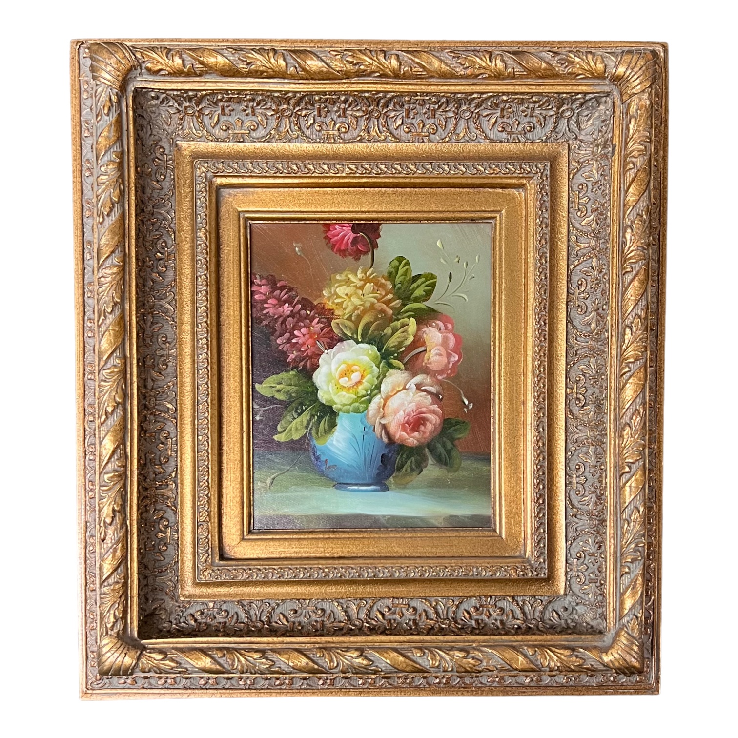 Design Plus Gallery presents a Floral Bouquet in Multi-Tiered Gold Frame. The painting depicts a lavish bouquet of flowers arranged in a delicate blue porcelain vase, set against a background of muted, pastel hues. The bouquet itself is a vibrant burst of colors, showcasing a variety of blossoms in full bloom. Radiant florals mingle with splashes of green stems creating a visually captivating composition. The blue vase acts as striking contrast to the vividness of the flowers. The porcelain exhibits a smooth, glossy texture, accentuating its refined craftsmanship.