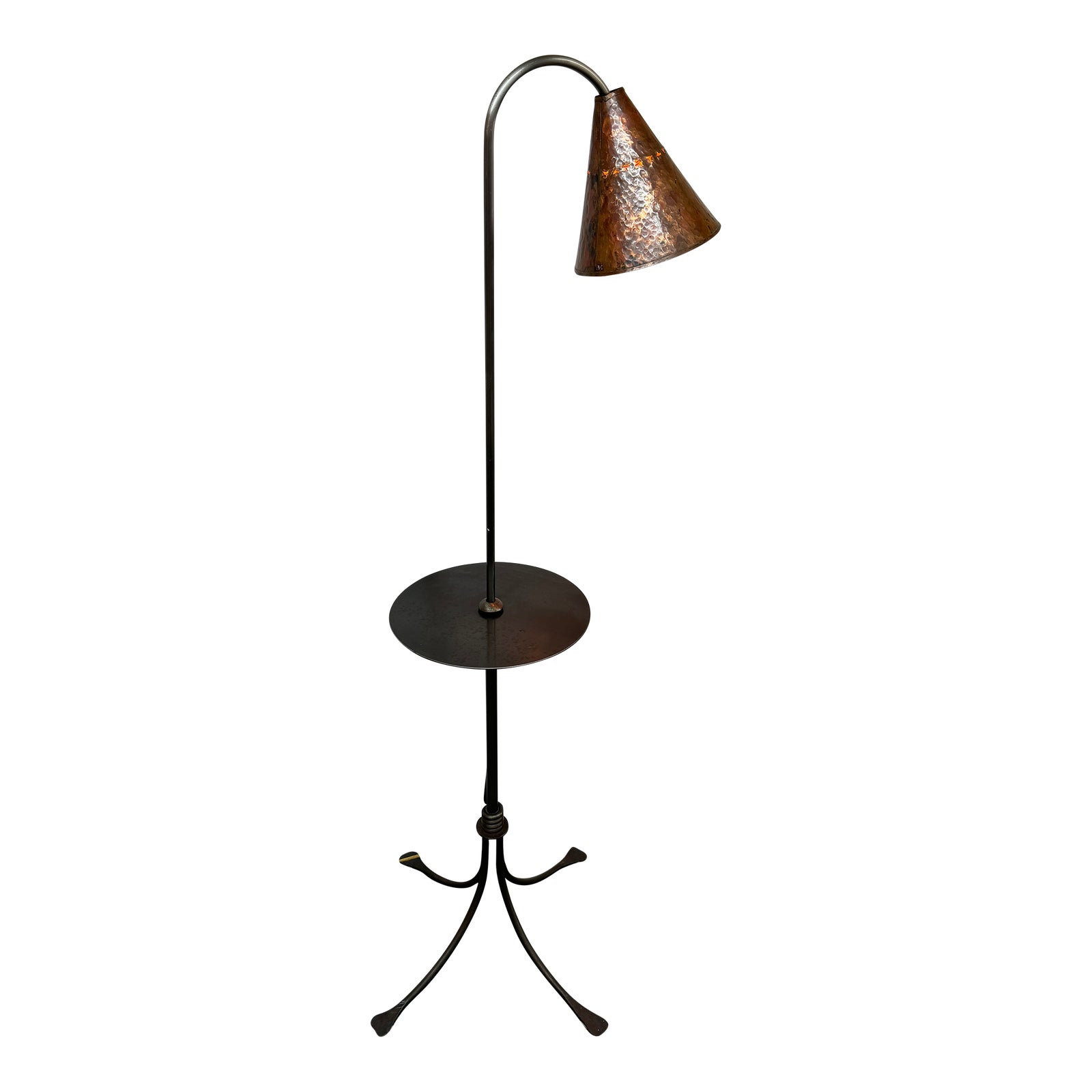 Design Plus Gallery presents a Vintage Forged Iron + Copper Lantern Style Floor Lamp. Arched iron arm extending a splay leg base. A circular table top in the middle of frame for showcasing your pictures or a placement for your drinks. Visible ant naturally distressed patina. A hammered and cut cone copper shade. In good condition, visible and minimal wear.