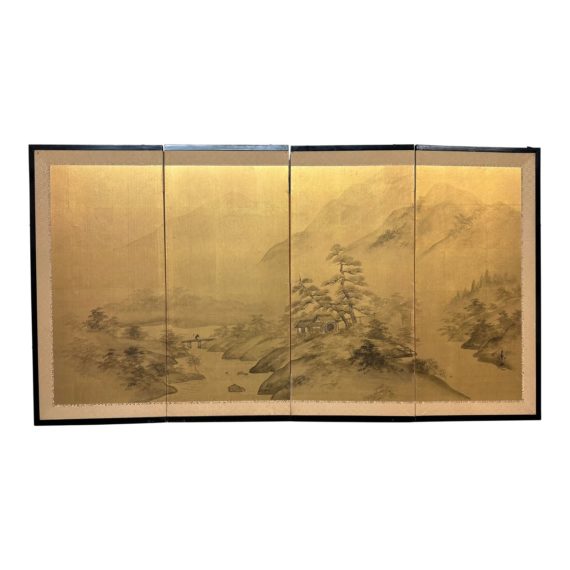 Design Plus Gallery presents a Four-Panel Asian Screen. Framed in wood and covered in paper, providing a sturdy base for the beautiful artwork that adorns it. The scenes depicted are classic Asian landscapes, filled with serene mountains, elegant trees, and flowing rivers, and a watermill all set against a backdrop of shimmering gold sheets. While there is some visible wear on the screen, it only serves to add character and history to the piece. A small holes on the top corners are a gentle reminder of the screen’s age and the stories it holds within its panels. In good condition for its age.