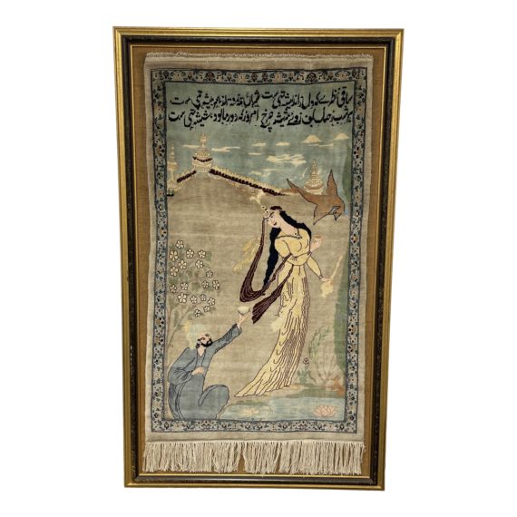 Design Plus Gallery presents a Vintage Framed Arabic Rug with two figures. Hushed muted tones shows a scene with two figures interacting in a landscape with animals and architecture about. Constructed of wool fibers, the rug does show wear from sun exposure. Art piece is in good condition. Framed in a floating fashion without glass. Back panel of frame is lined with a tan burlap. Frame is painted black with gold accents.