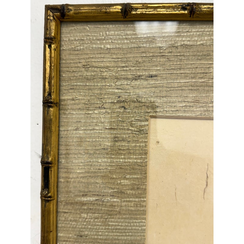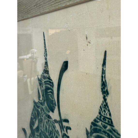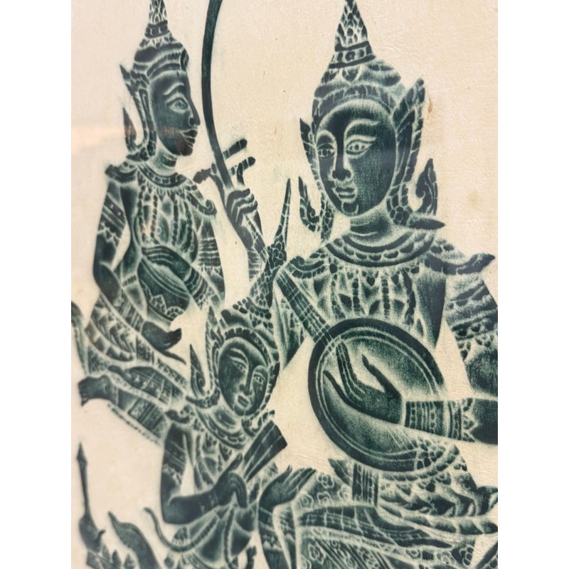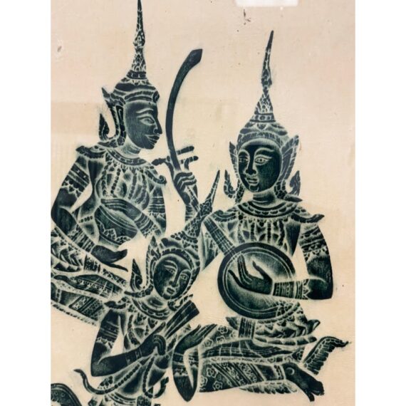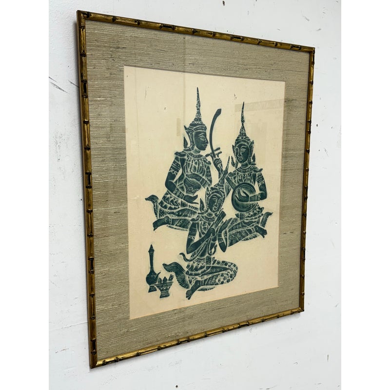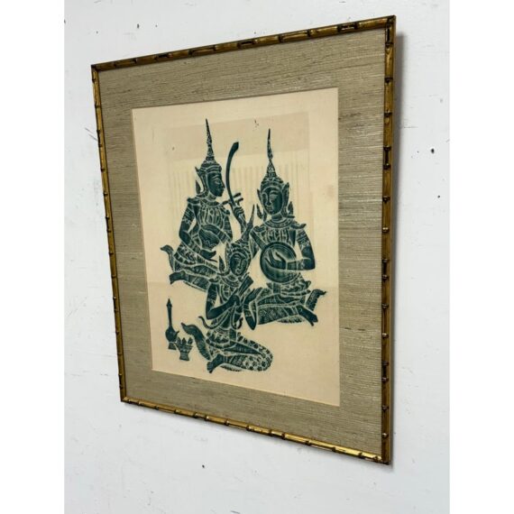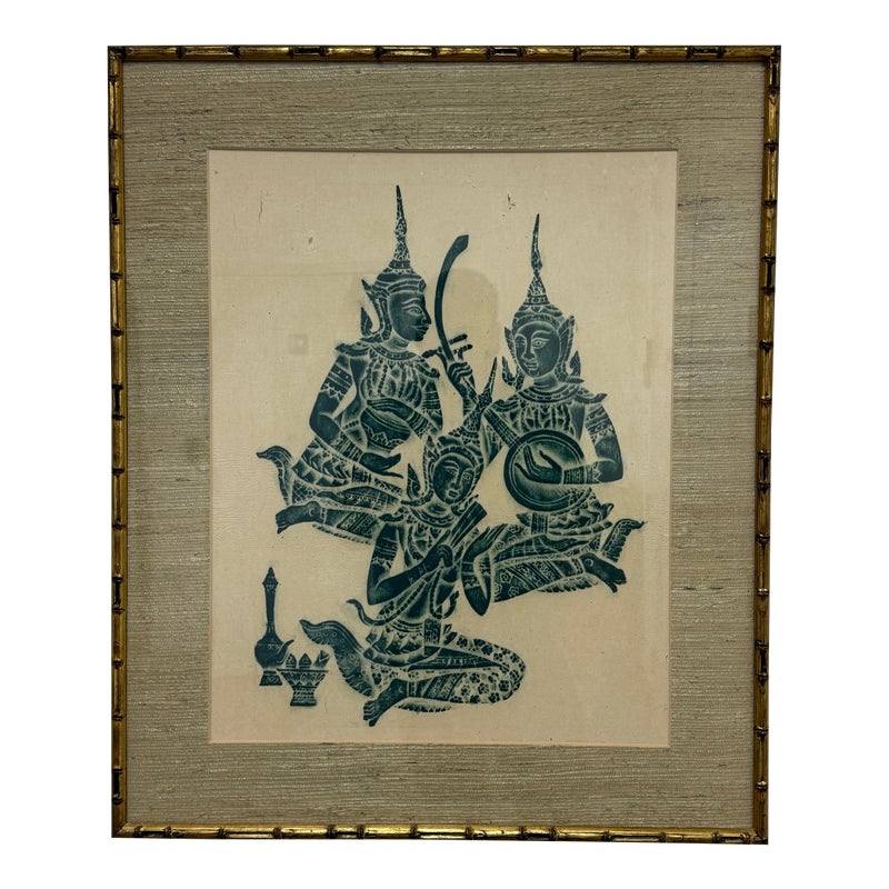 Design Plus Gallery presents a Vintage Framed Thai Rubbing of Musicians. A serene scene of three musicians in front of a traditional brown temple. The artwork is created using delicate charcoal rubbing techniques on authentic rice paper, showcasing intricate details and a subtle contrast between the figures and the temple background. The monochromatic tones highlight the textures and fine lines, emphasizing the cultural essence and historic ambiance of the composition. Custom framed and matted. In good condition, visible and minimal wear.
