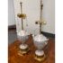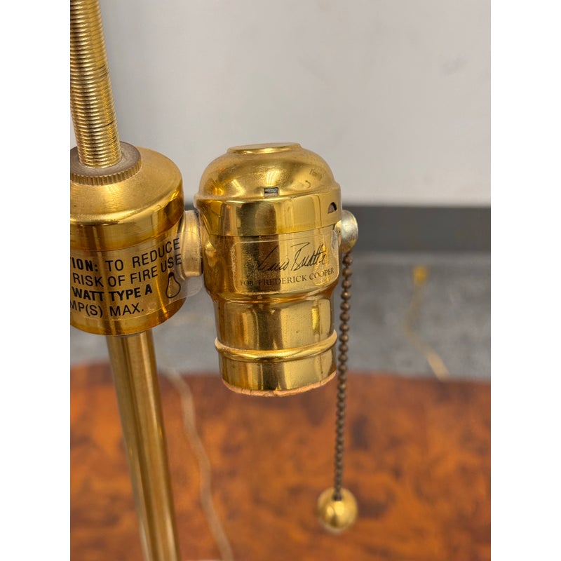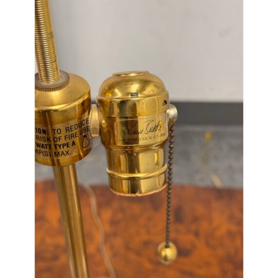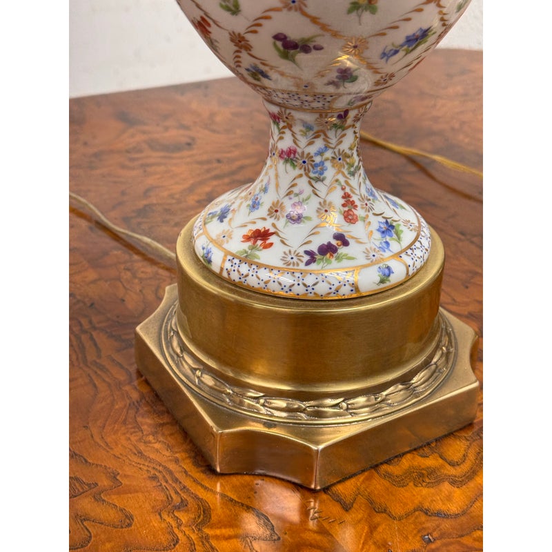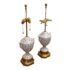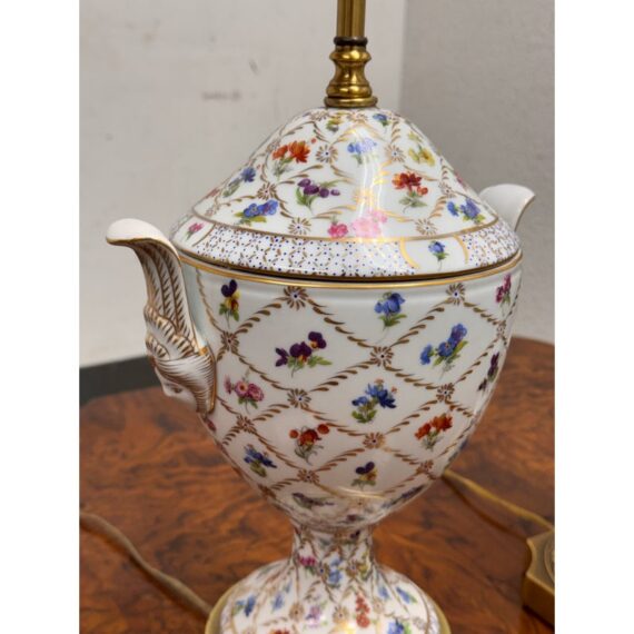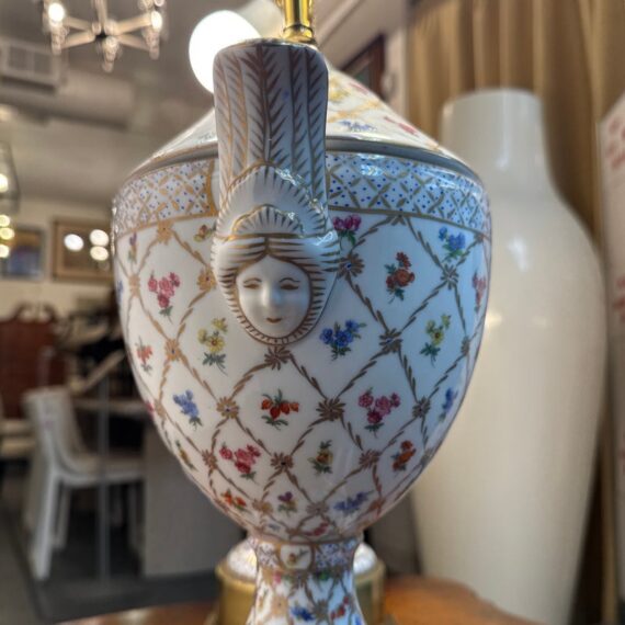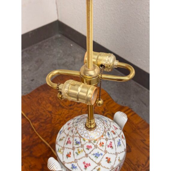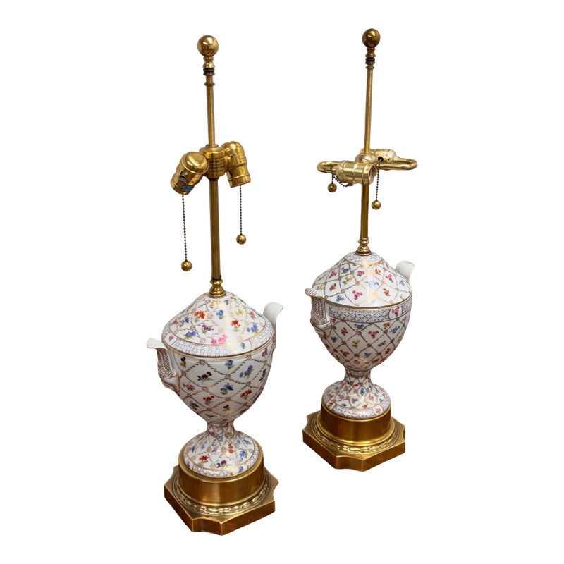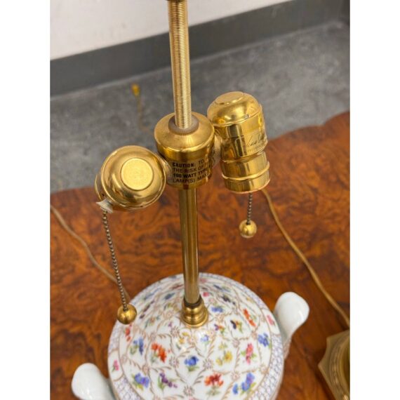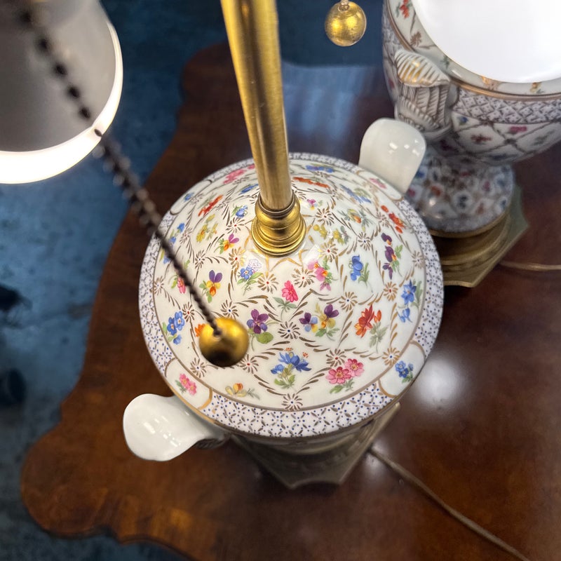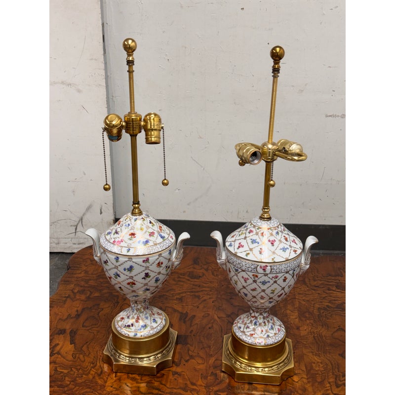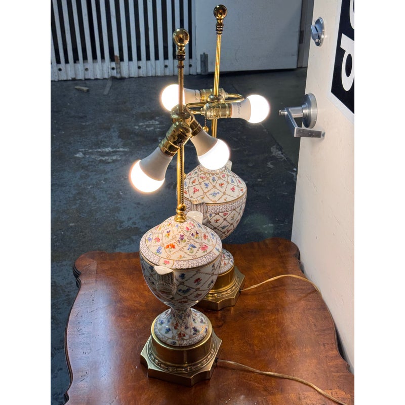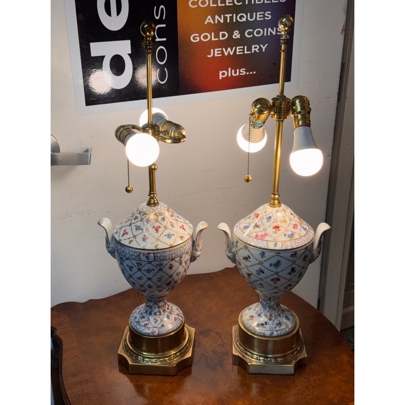Design Plus Gallery presents a Pair of Vintage Frederick Cooper Porcelain Table Lamps. They have urn form bodies detailed in an allover floral pattern and accented by classical brass mounts. The lidded porcelain forms are shaped with side handles and raised on stepped brass bases, while the tall brass standards retain double socket assemblies with pull chains and ball finials. The decoration combines delicate florals with lattice and border motifs that give the pair a formal, highly ornamental character. They are in good condition with visible and minimal wear from usage. Made in the USA.