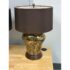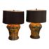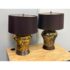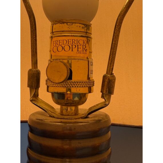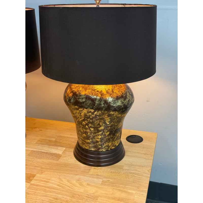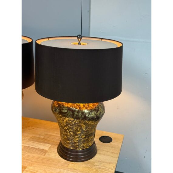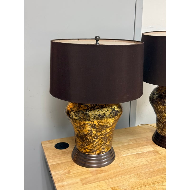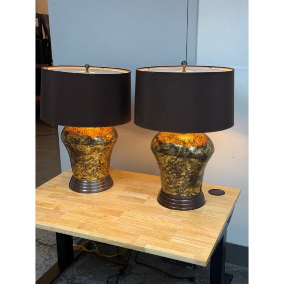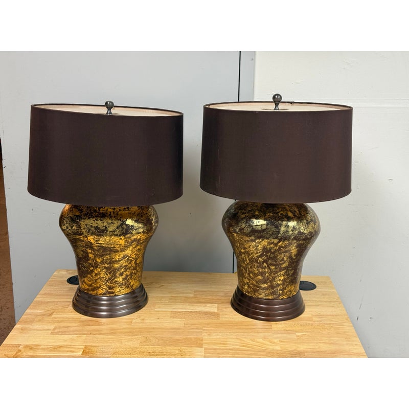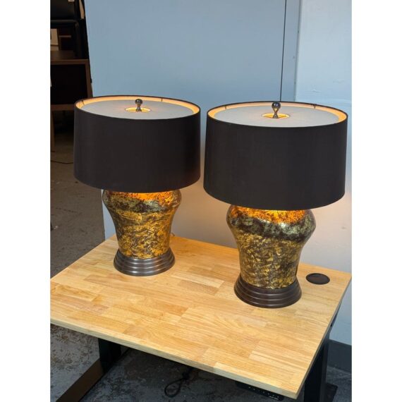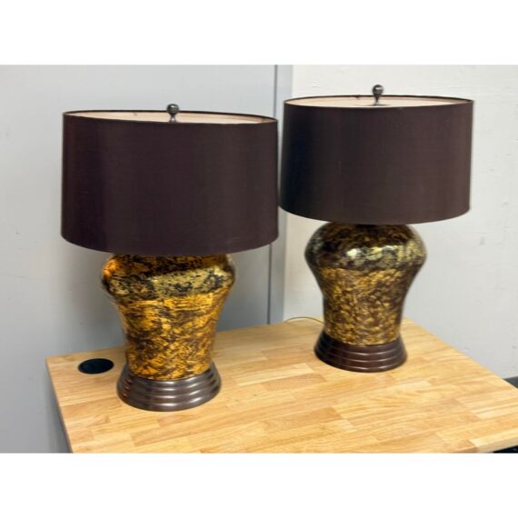 Design Plus Gallery presents a Pair of Golden Metallic Frederick Cooper Table Lamps. Nearly vintage in age but you can’t tell are these dynamic swirled gold and deep brown lamps with metallic radiance. Brass hardware with mahogany base and dark brown drum shades. They are in good condition for their vintage age + use.