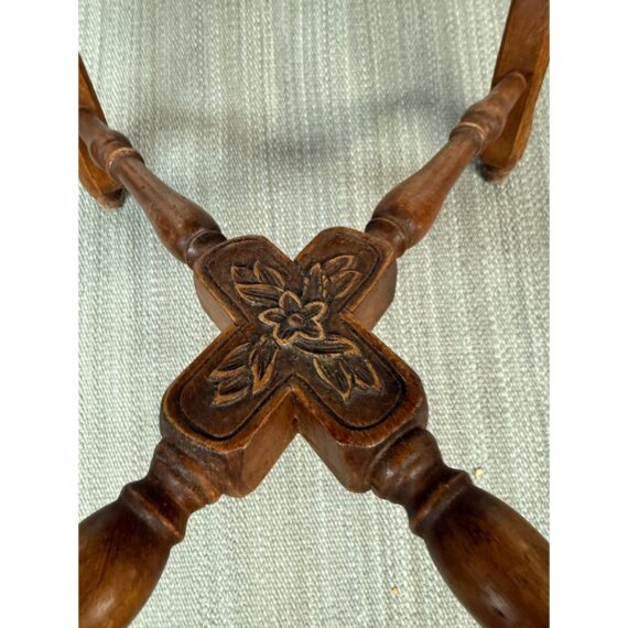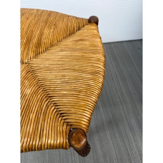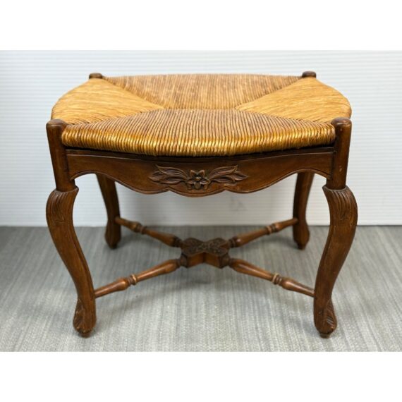 Design Plus Gallery presents a French Country Carved Rush Stool or Bench. Solid wood frame is beautifully carved and stained win a warm, dark finish. Seat is fixed with a woven natural rush seat while base is reinforced with a box trestle. Stool, bench is in good condition.
